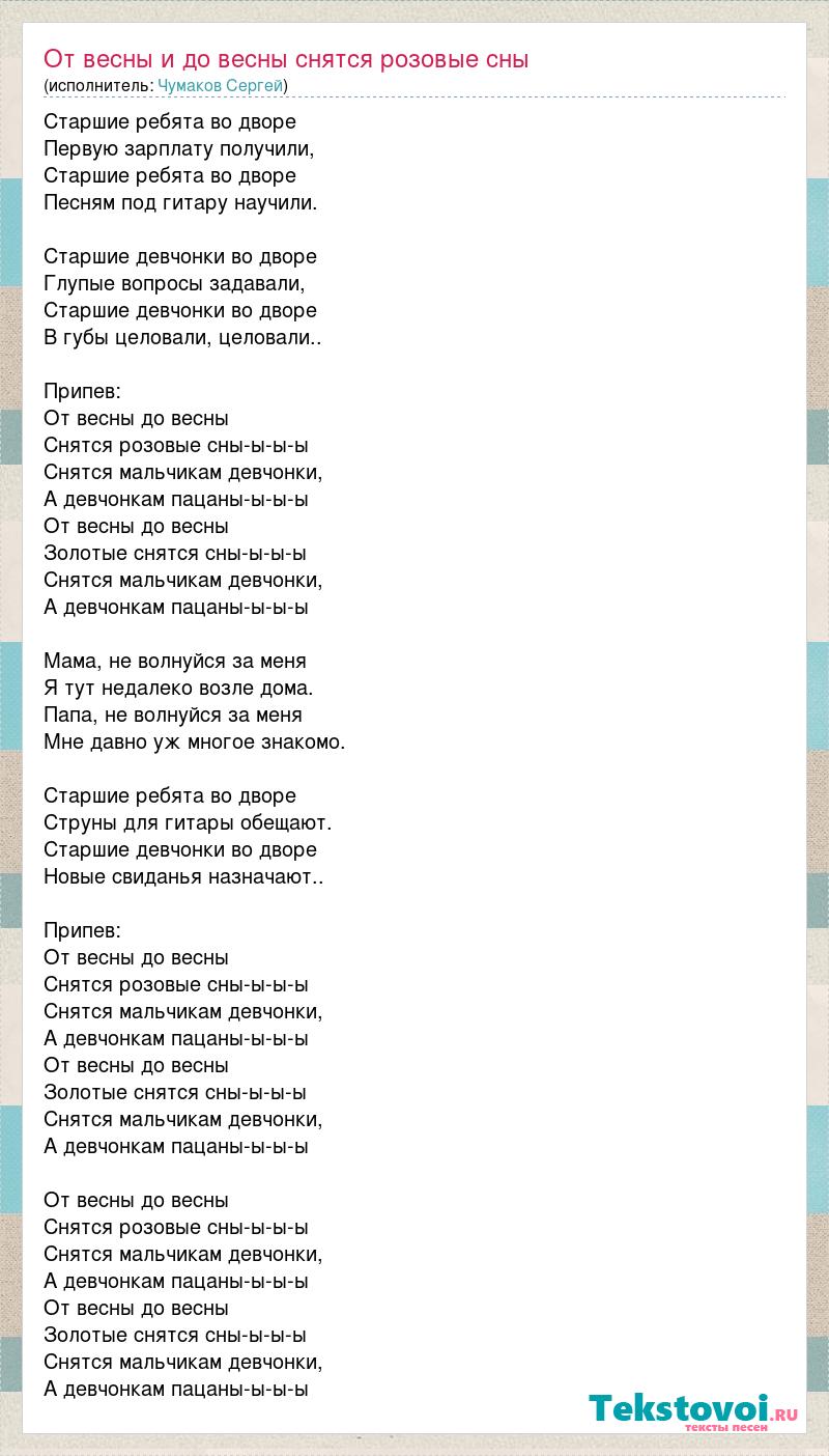 Старшие ребята во дворе Первую зарплату получили, Старшие ребята во дворе Песням под гитару научили. Старшие девчонки во дворе Глупые вопросы задавали, Старшие девчонки во дворе В губы целовали, целовали.. Припев: От весны до весны Снятся розовые сны-ы-ы-ы Снятся мальчикам девчонки, А девчонкам пацаны-ы-ы-ы От весны до весны Золотые снятся сны-ы-ы-ы Снятся мальчикам девчонки, А девчонкам пацаны-ы-ы-ы Мама, не волнуйся за меня Я тут недалеко возле дома. Папа, не волнуйся за меня Мне давно уж многое знакомо. Старшие ребята во дворе Струны для гитары обещают. Старшие девчонки во дворе Новые свиданья назначают.. Припев: От весны до весны Снятся розовые сны-ы-ы-ы Снятся мальчикам девчонки, А девчонкам пацаны-ы-ы-ы От весны до весны Золотые снятся сны-ы-ы-ы Снятся мальчикам девчонки, А девчонкам пацаны-ы-ы-ы От весны до весны Снятся розовые сны-ы-ы-ы Снятся мальчикам девчонки, А девчонкам пацаны-ы-ы-ы От весны до весны Золотые снятся сны-ы-ы-ы Снятся мальчикам девчонки, А девчонкам пацаны-ы-ы-ы