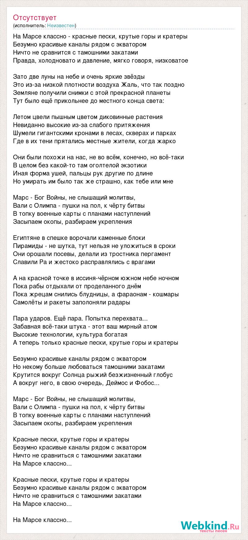 На Марсе классно - красные пески, крутые горы и кратеры Безумно красивые каналы рядом с экватором Ничто не сравнится с тамошними закатами Правда, холодновато и давление, мягко говоря, низковатое Зато две луны на небе и очень яркие звёзды Это из-за низкой плотности воздуха Жаль, что так поздно Земляне получили снимки с этой прекрасной планеты Тут было ещё прикольнее до местного конца света: Летом цвели пышным цветом диковинные растения Невиданно высокие из-за слабого притяжения Шумели гигантскими кронами в лесах, скверах и парках Где в их тени прятались местные жители, когда жарко Они были похожи на нас, не во всём, конечно, но всё-таки В целом без какой-то там оголтелой экзотики Иная форма ушей, пальцы рук другие по длине Но умирать им было так же страшно, как тебе или мне Марс - Бог Войны, не слышащий молитвы, Вали с Олимпа - пушки на пол, к чёрту битвы В топку военные карты с планами наступлений Засыпаем окопы, разбираем укрепления Египтяне в спешке ворочали каменные блоки Пирамиды - не шутка, тут нельзя не уложиться в сроки Они орошали посевы, делали из тростника пергамент Славили Ра и жестоко расправлялись с врагами А на красной точке в иссиня-чёрном южном небе ночном Пока рабы отдыхали от проделанного днём Пока жрецам снились блудницы, а фараонам - кошмары Самолёты и ракеты заполоняли радары Пара ударов. Ещё пара. Попытка перехвата... Забавная всё-таки штука - этот ваш мирный атом Высокие технологии, культура богатая А теперь только красные пески, крутые горы и кратеры Безумно красивые каналы рядом с экватором Но некому больше любоваться тамошними закатами Крутится вокруг Солнца рыжий безжизненный глобус А вокруг него, в свою очередь, Деймос и Фобос... Марс - Бог Войны, не слышащий молитвы, Вали с Олимпа - пушки на пол, к чёрту битвы В топку военные карты с планами наступлений Засыпаем окопы, разбираем укрепления Красные пески, крутые горы и кратеры Безумно красивые каналы рядом с экватором Ничто не сравниться с тамошними закатами На Марсе классно... Красные пески, крутые горы и кратеры Безумно красивые каналы рядом с экватором Ничто не сравниться с тамошними закатами На Марсе классно... На Марсе классно...