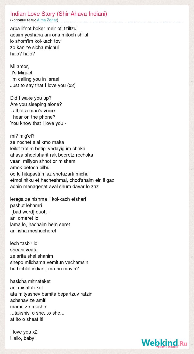 arba lifnot boker meir oti tziltzul adaim yeshana ani ona mitoch shi'ul lo shom'im kol-kach tov zo kanir'e sicha michul halo? halo? Mi amor, It's Miguel I'm calling you in Israel Just to say that I love you (x2) Did I wake you up? Are you sleeping alone? Is that a man's voice I hear on the phone? You know that I love you - mi? mig'el? ze nochet alai kmo maka leilot trofim betipi vedayig im chaka ahava sheefsharit rak beeretz rechoka veani miliyon shnot or misham amok betoch bilbul od lo hitapasti miaz shefazarti michul etmol nitku et hacheshmal, chod'shaim ein li gaz adain menagenet aval shum davar lo zaz lerega ze nishma li kol-kach efshari pashut lehamri [bad word] quot; - ani omeret lo lama lo, hachaim hem seret ani isha meshucheret lech tasbir lo sheani veata ze srita shel shanim shepo milchama vemitun vechamsin hu bichlal indiani, ma hu mavin? hasicha mitnateket ani mishtateket ata mityashev bamita bepartzuv ratzini achshav ze amiti mami, ze moshe ...takshivi o she...o she... at ito o sheat iti I love you x2 Hallo, baby!