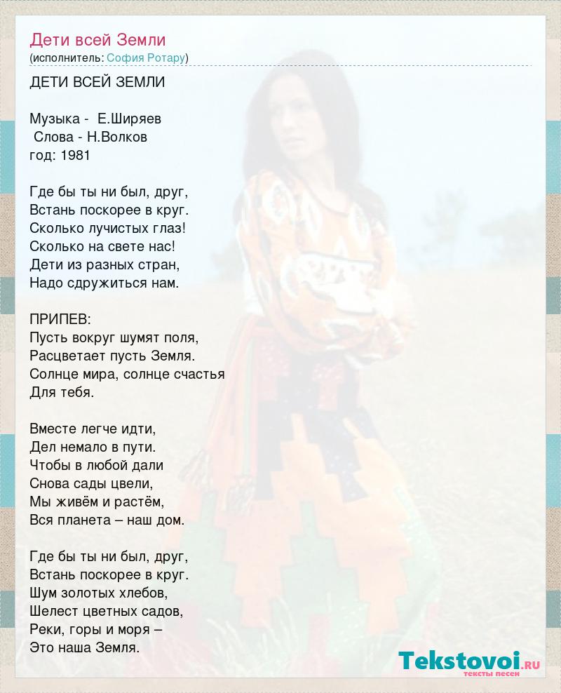 ДЕТИ ВСЕЙ ЗЕМЛИ Музыка - Е.Ширяев Слова - Н.Волков год: 1981 Где бы ты ни был, друг, Встань поскорее в круг. Сколько лучистых глаз! Сколько на свете нас! Дети из разных стран, Надо сдружиться нам. ПРИПЕВ: Пусть вокруг шумят поля, Расцветает пусть Земля. Солнце мира, солнце счастья Для тебя. Вместе легче идти, Дел немало в пути. Чтобы в любой дали Снова сады цвели, Мы живём и растём, Вся планета – наш дом. Где бы ты ни был, друг, Встань поскорее в круг. Шум золотых хлебов, Шелест цветных садов, Реки, горы и моря – Это наша Земля.