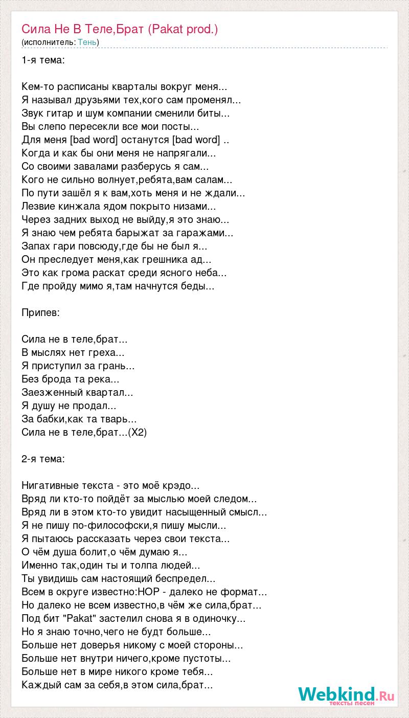 1-я тема: Кем-то расписаны кварталы вокруг меня... Я называл друзьями тех,кого сам променял... Звук гитар и шум компании сменили биты... Вы слепо пересекли все мои посты... Для меня [bad word] останутся [bad word] .. Когда и как бы они меня не напрягали... Со своими завалами разберусь я сам... Кого не сильно волнует,ребята,вам салам... По пути зашёл я к вам,хоть меня и не ждали... Лезвие кинжала ядом покрыто низами... Через задних выход не выйду,я это знаю... Я знаю чем ребята барыжат за гаражами... Запах гари повсюду,где бы не был я... Он преследует меня,как грешника ад... Это как грома раскат среди ясного неба... Где пройду мимо я,там начнутся беды... Припев: Сила не в теле,брат... В мыслях нет греха... Я приступил за грань... Без брода та река... Заезженный квартал... Я душу не продал... За бабки,как та тварь... Сила не в теле,брат...(Х2) 2-я тема: Нигативные текста - это моё крэдо... Вряд ли кто-то пойдёт за мыслью моей следом... Вряд ли в этом кто-то увидит насыщенный смысл... Я не пишу по-философски,я пишу мысли... Я пытаюсь рассказать через свои текста... О чём душа болит,о чём думаю я... Именно так,один ты и толпа людей... Ты увидишь сам настоящий беспредел... Всем в округе известно:HOP - далеко не формат... Но далеко не всем известно,в чём же сила,брат... Под бит "Pakat" застелил снова я в одиночку... Но я знаю точно,чего не будт больше... Больше нет доверья никому с моей стороны... Больше нет внутри ничего,кроме пустоты... Больше нет в мире никого кроме тебя... Каждый сам за себя,в этом сила,брат...