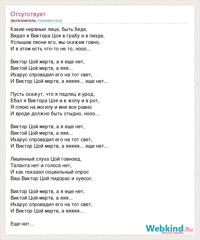Какие нервные лица, быть беде, Видал я Виктора Цоя в грабу и в пизде, Услышав песни его, мы скажем говно, И в этом есть что-то не то, нооо... Виктор Цой мертв, а я еще нет, Виктой Цой мертв, а яяя... Икарус спровадил его на тот свет, И Виктор Цой мертв, а яяяяя... еще нет... Пусть скажут, что я падлец и урод, Ебал я Виктора Цоя и в жопу и в рот, Я плюю на могилу и мне все равно И вроде должно быть стыдно, нооо... Виктор Цой мертв, а я еще нет, Виктой Цой мертв, а яяя... Икарус спровадил его на тот свет, И Виктор Цой мертв, а яяяяя... еще нет... Лишенный слуха Цой говноед, Таланта нет и голоса нет, И как показал социальный опрос Ваш Виктор Цой пидорас и хуесос. Виктор Цой мертв, а я еще нет, Виктой Цой мертв, а яяя... Икарус спровадил его на тот свет, И Виктор Цой мертв, а яяяяя... Еще нет...