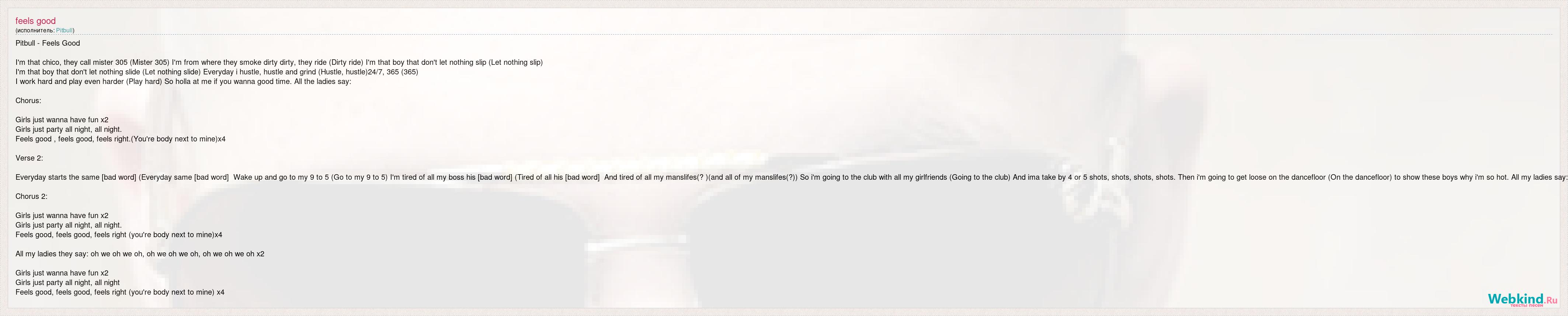 Pitbull - Feels Good I'm that chico, they call mister 305 (Mister 305) I'm from where they smoke dirty dirty, they ride (Dirty ride) I'm that boy that don't let nothing slip (Let nothing slip) I'm that boy that don't let nothing slide (Let nothing slide) Everyday i hustle, hustle and grind (Hustle, hustle)24/7, 365 (365) I work hard and play even harder (Play hard) So holla at me if you wanna good time. All the ladies say: Chorus: Girls just wanna have fun x2 Girls just party all night, all night. Feels good , feels good, feels right.(You're body next to mine)x4 Verse 2: Everyday starts the same [bad word] (Everyday same [bad word] Wake up and go to my 9 to 5 (Go to my 9 to 5) I'm tired of all my boss his [bad word] (Tired of all his [bad word] And tired of all my manslifes(? )(and all of my manslifes(?)) So i'm going to the club with all my girlfriends (Going to the club) And ima take by 4 or 5 shots, shots, shots, shots. Then i'm going to get loose on the dancefloor (On the dancefloor) to show these boys why i'm so hot. All my ladies say: Chorus 2: Girls just wanna have fun x2 Girls just party all night, all night. Feels good, feels good, feels right (you're body next to mine)x4 All my ladies they say: oh we oh we oh, oh we oh we oh, oh we oh we oh x2 Girls just wanna have fun x2 Girls just party all night, all night Feels good, feels good, feels right (you're body next to mine) x4