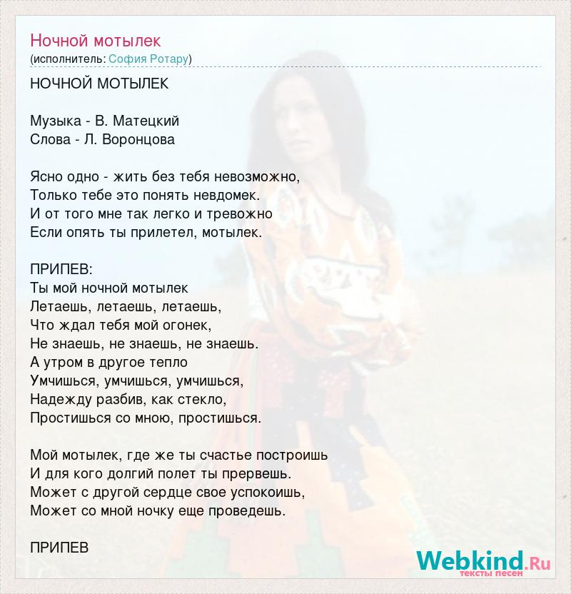 НОЧНОЙ МОТЫЛЕК Музыка - В. Матецкий Слова - Л. Воронцова Ясно одно - жить без тебя невозможно, Только тебе это понять невдомек. И от того мне так легко и тревожно Если опять ты прилетел, мотылек. ПРИПЕВ: Ты мой ночной мотылек Летаешь, летаешь, летаешь, Что ждал тебя мой огонек, Не знаешь, не знаешь, не знаешь. А утром в другое тепло Умчишься, умчишься, умчишься, Надежду разбив, как стекло, Простишься со мною, простишься. Мой мотылек, где же ты счастье построишь И для кого долгий полет ты прервешь. Может с другой сердце свое успокоишь, Может со мной ночку еще проведешь. ПРИПЕВ