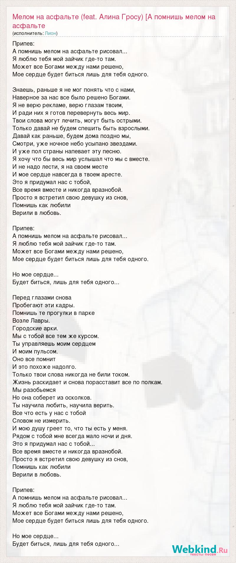 Припев: А помнишь мелом на асфальте рисовал... Я люблю тебя мой зайчик где-то там. Может все Богами между нами решено, Мое сердце будет биться лишь для тебя одного. Знаешь, раньше я не мог понять что с нами, Наверное за нас все было решено Богами. Я не верю рекламе, верю глазам твоим, И ради них я готов перевернуть весь мир. Твои слова могут лечить, могут быть острыми. Только давай не будем спешить быть взрослыми. Давай как раньше, будем дома поздно мы, Смотри, уже ночное небо усыпано звездами. И уже пол страны напевает эту песню. Я хочу что бы весь мир услышал что мы с вместе. И не надо лести, я на своем месте И мое сердце навсегда в твоем аресте. Это я придумал нас с тобой, Все время вместе и никогда вразнобой. Просто я встретил свою девушку из снов, Помнишь как любили Верили в любовь. Припев: А помнишь мелом на асфальте рисовал... Я люблю тебя мой зайчик где-то там. Может все Богами между нами решено, Мое сердце будет биться лишь для тебя одного. Но мое сердце... Будет биться, лишь для тебя одного... Перед глазами снова Пробегают эти кадры. Помнишь те прогулки в парке Возле Лавры. Городские арки. Мы с тобой все тем же курсом. Ты управляешь моим сердцем И моим пульсом. Оно все помнит И это похоже надолго. Только твои слова никогда не били током. Жизнь раскидает и снова порасставит все по полкам. Мы разобьемся Но она соберет из осколков. Ты научила любить, научила верить. Все что есть у нас с тобой Словом не измерить. И мою душу греет то, что ты есть у меня. Рядом с тобой мне всегда мало ночи и дня. Это я придумал нас с тобой... Все время вместе и никогда вразнобой. Просто я встретил свою девушку из снов, Помнишь как любили Верили в любовь. Припев: А помнишь мелом на асфальте рисовал... Я люблю тебя мой зайчик где-то там. Может все Богами между нами решено, Мое сердце будет биться лишь для тебя одного. Но мое сердце... Будет биться, лишь для тебя одного...
