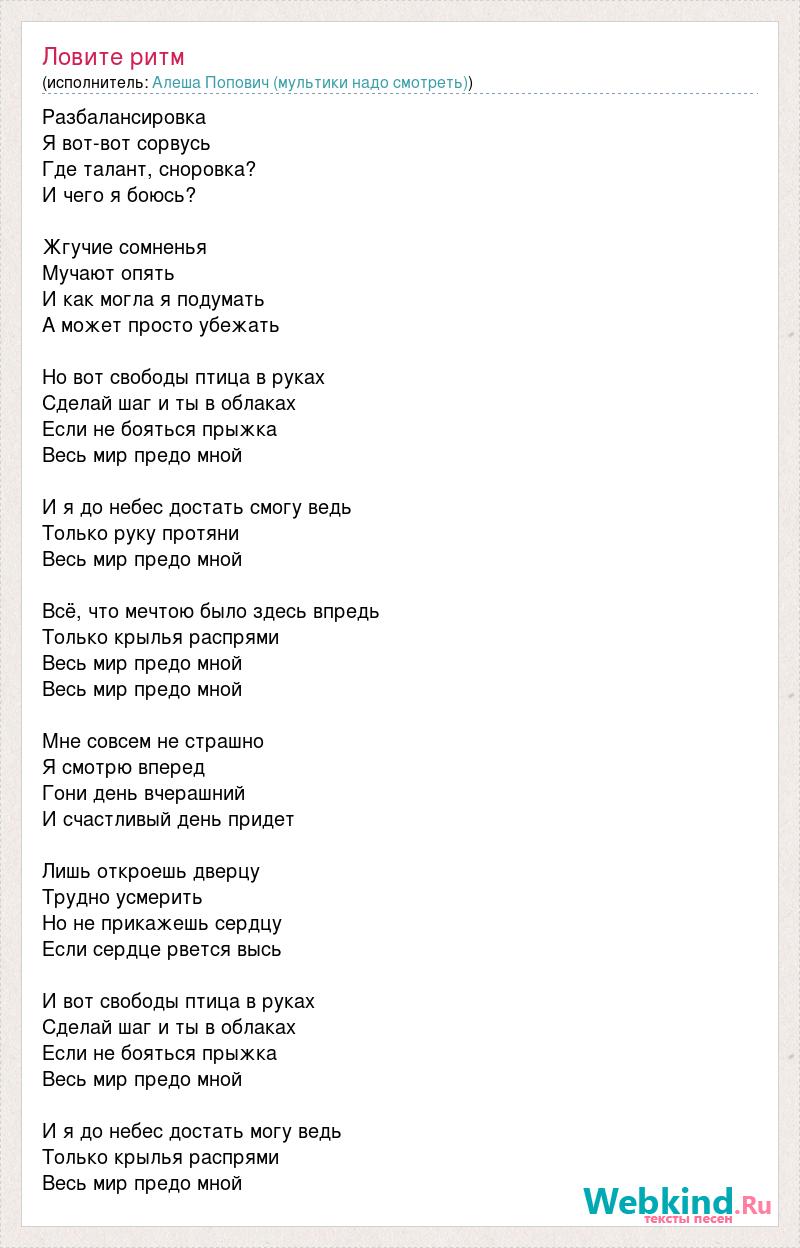 Разбалансировка Я вот-вот сорвусь Где талант, сноровка? И чего я боюсь? Жгучие сомненья Мучают опять И как могла я подумать А может просто убежать Но вот свободы птица в руках Сделай шаг и ты в облаках Если не бояться прыжка Весь мир предо мной И я до небес достать смогу ведь Только руку протяни Весь мир предо мной Всё, что мечтою было здесь впредь Только крылья распрями Весь мир предо мной Весь мир предо мной Мне совсем не страшно Я смотрю вперед Гони день вчерашний И счастливый день придет Лишь откроешь дверцу Трудно усмерить Но не прикажешь сердцу Если сердце рвется высь И вот свободы птица в руках Сделай шаг и ты в облаках Если не бояться прыжка Весь мир предо мной И я до небес достать могу ведь Только крылья распрями Весь мир предо мной