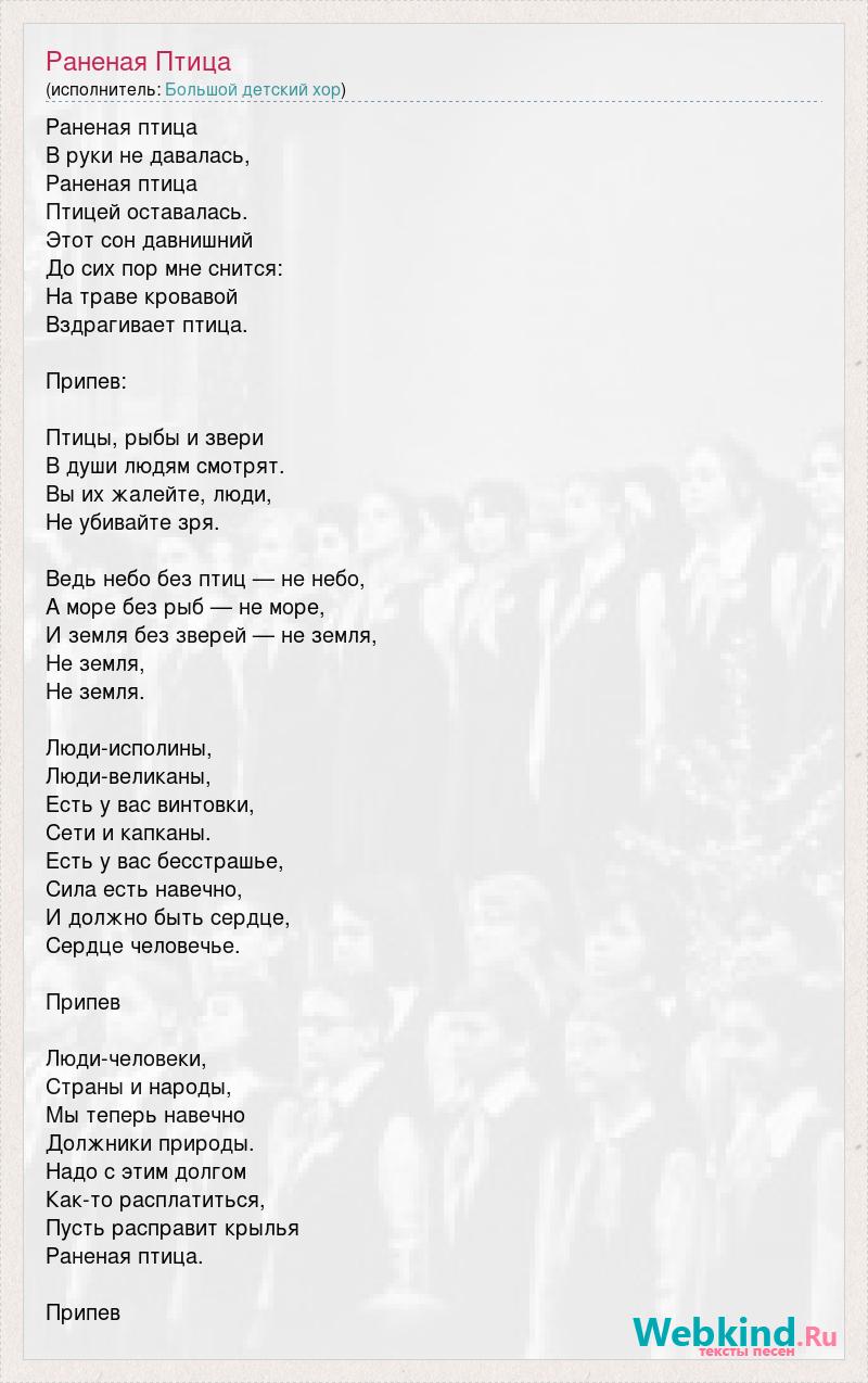 Раненая птица В руки не давалась, Раненая птица Птицей оставалась. Этот сон давнишний До сих пор мне снится: На траве кровавой Вздрагивает птица. Припев: Птицы, рыбы и звери В души людям смотрят. Вы их жалейте, люди, Не убивайте зря. Ведь небо без птиц — не небо, А море без рыб — не море, И земля без зверей — не земля, Не земля, Не земля. Люди-исполины, Люди-великаны, Есть у вас винтовки, Сети и капканы. Есть у вас бесстрашье, Сила есть навечно, И должно быть сердце, Сердце человечье. Припев Люди-человеки, Страны и народы, Мы теперь навечно Должники природы. Надо с этим долгом Как-то расплатиться, Пусть расправит крылья Раненая птица. Припев