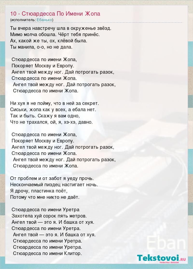 Ты вчера навстречу шла в окруженье звёзд. Мимо молча обошла. Чёрт тебя принёс. Ах, какой же ты, ох, клёвой была. Ты манила, о-о, но не дала. Стюардесса по имени Жопа, Покоряет Москву и Европу. Ангел твой между ног. Дай потрогать разок, Стюардесса по имени Жопа. Ангел твой между ног. Дай потрогать разок, Стюардесса по имени Жопа. Ни хуя я не пойму, что в ней за секрет. Сиськи, жопа как у всех, а ебала нет. Так и быть. Скажу я вам одно, Что не трахался, ой, я, хэ-хэ, давно. Стюардесса по имени Жопа, Покоряет Москву и Европу. Ангел твой между ног. Дай потрогать разок, Стюардесса по имени Жопа. Ангел твой между ног. Дай потрогать разок, Стюардесса по имени Жопа. От проблем и от забот я уеду прочь. Нескончаемый пиздец настигает ночь. Я дрочу, пластинка поёт, Потому что мне никто не даёт. Стюардесса по имени Уретра Захотела хуй сорок пять метров. Ангел твой — это я. И башка от хуя. Стюардесса по имени Уретра. Ангел твой — это я. И башка от хуя. Стюардесса по имени Уретра. Стюардесса по имени Уретра. Стюардесса по имени Клитор.