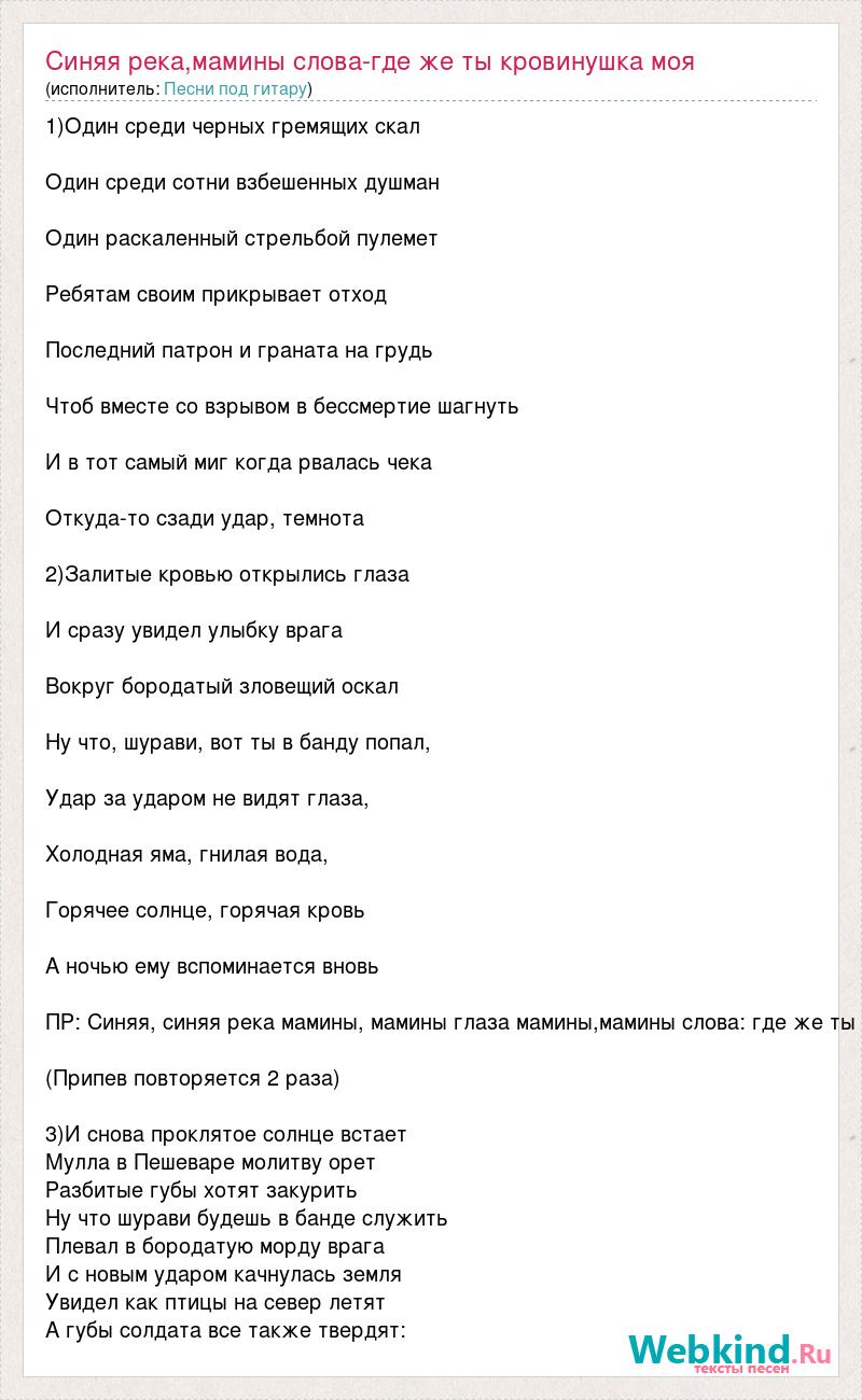 1)Один среди черных гремящих скал Один среди сотни взбешенных душман Один раскаленный стрельбой пулемет Ребятам своим прикрывает отход Последний патрон и граната на грудь Чтоб вместе со взрывом в бессмертие шагнуть И в тот самый миг когда рвалась чека Откуда-то сзади удар, темнота 2)Залитые кровью открылись глаза И сразу увидел улыбку врага Вокруг бородатый зловещий оскал Ну что, шурави, вот ты в банду попал, Удар за ударом не видят глаза, Холодная яма, гнилая вода, Горячее солнце, горячая кровь А ночью ему вспоминается вновь ПР: Синяя, синяя река мамины, мамины глаза мамины,мамины слова: где же ты (Припев повторяется 2 раза) 3)И снова проклятое солнце встает Мулла в Пешеваре молитву орет Разбитые губы хотят закурить Ну что шурави будешь в банде служить Плевал в бородатую морду врага И с новым ударом качнулась земля Увидел как птицы на север летят А губы солдата все также твердят: