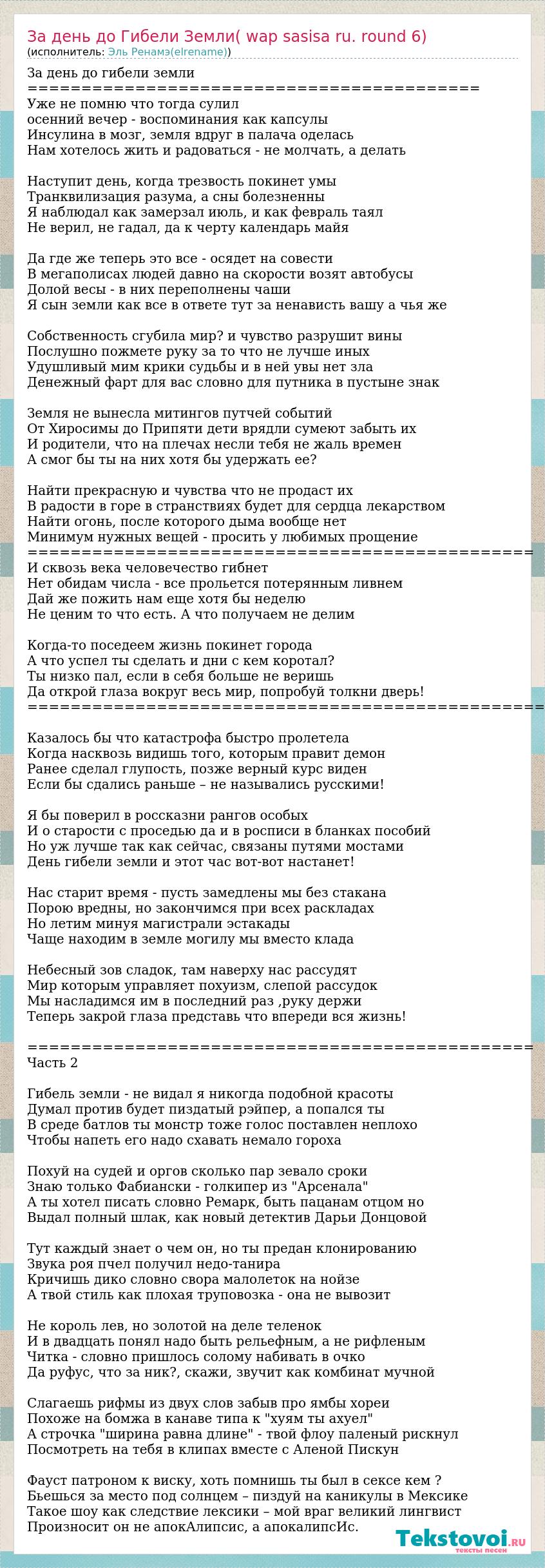 За день до гибели земли ========================================== Уже не помню что тогда сулил осенний вечер - воспоминания как капсулы Инсулина в мозг, земля вдруг в палача оделась Нам хотелось жить и радоваться - не молчать, а делать Наступит день, когда трезвость покинет умы Транквилизация разума, а сны болезненны Я наблюдал как замерзал июль, и как февраль таял Не верил, не гадал, да к черту календарь майя Да где же теперь это все - осядет на совести В мегаполисах людей давно на скорости возят автобусы Долой весы - в них переполнены чаши Я сын земли как все в ответе тут за ненависть вашу а чья же Собственность сгубила мир? и чувство разрушит вины Послушно пожмете руку за то что не лучше иных Удушливый мим крики судьбы и в ней увы нет зла Денежный фарт для вас словно для путника в пустыне знак Земля не вынесла митингов путчей событий От Хиросимы до Припяти дети врядли сумеют забыть их И родители, что на плечах несли тебя не жаль времен А смог бы ты на них хотя бы удержать ее? Найти прекрасную и чувства что не продаст их В радости в горе в странствиях будет для сердца лекарством Найти огонь, после которого дыма вообще нет Минимум нужных вещей - просить у любимых прощение =============================================== И сквозь века человечество гибнет Нет обидам числа - все прольется потерянным ливнем Дай же пожить нам еще хотя бы неделю Не ценим то что есть. А что получаем не делим Когда-то поседеем жизнь покинет города А что успел ты сделать и дни с кем коротал? Ты низко пал, если в себя больше не веришь Да открой глаза вокруг весь мир, попробуй толкни дверь! ================================================ Казалось бы что катастрофа быстро пролетела Когда насквозь видишь того, которым правит демон Ранее сделал глупость, позже верный курс виден Если бы сдались раньше – не назывались русскими! Я бы поверил в россказни рангов особых И о старости с проседью да и в росписи в бланках пособий Но уж лучше так как сейчас, связаны путями мостами День гибели земли и этот час вот-вот настанет! Нас старит время - пусть замедлены мы без стакана Порою вредны, но закончимся при всех раскладах Но летим минуя магистрали эстакады Чаще находим в земле могилу мы вместо клада Небесный зов сладок, там наверху нас рассудят Мир которым управляет похуизм, слепой рассудок Мы насладимся им в последний раз ,руку держи Теперь закрой глаза представь что впереди вся жизнь! =============================================== Часть 2 Гибель земли - не видал я никогда подобной красоты Думал против будет пиздатый рэйпер, а попался ты В среде батлов ты монстр тоже голос поставлен неплохо Чтобы напеть его надо схавать немало гороха Похуй на судей и оргов сколько пар зевало сроки Знаю только Фабиански - голкипер из "Арсенала" А ты хотел писать словно Ремарк, быть пацанам отцом но Выдал полный шлак, как новый детектив Дарьи Донцовой Тут каждый знает о чем он, но ты предан клонированию Звука роя пчел получил недо-танира Кричишь дико словно свора малолеток на нойзе А твой стиль как плохая труповозка - она не вывозит Не король лев, но золотой на деле теленок И в двадцать понял надо быть рельефным, а не рифленым Читка - словно пришлось солому набивать в очко Да руфус, что за ник?, скажи, звучит как комбинат мучной Слагаешь рифмы из двух слов забыв про ямбы хореи Похоже на бомжа в канаве типа к "хуям ты ахуел" А строчка "ширина равна длине" - твой флоу паленый рискнул Посмотреть на т