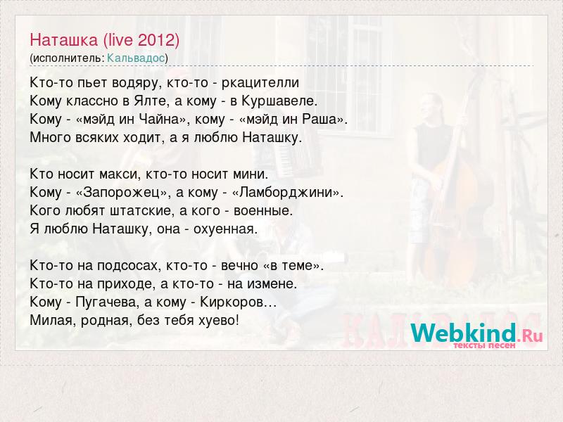 Кто-то пьет водяру, кто-то - ркацителли Кому классно в Ялте, а кому - в Куршавеле. Кому - «мэйд ин Чайна», кому - «мэйд ин Раша». Много всяких ходит, а я люблю Наташку. Кто носит макси, кто-то носит мини. Кому - «Запорожец», а кому - «Ламборджини». Кого любят штатские, а кого - военные. Я люблю Наташку, она - охуенная. Кто-то на подсосах, кто-то - вечно «в теме». Кто-то на приходе, а кто-то - на измене. Кому - Пугачева, а кому - Киркоров… Милая, родная, без тебя хуево!