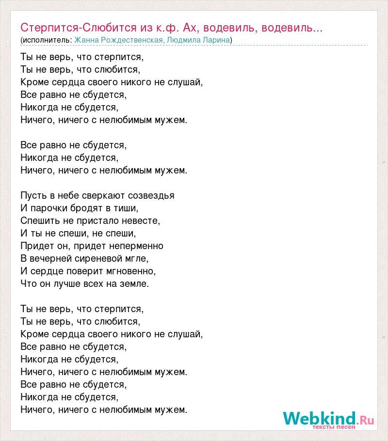 Ты не верь, что стерпится, Ты не верь, что слюбится, Кроме сердца своего никого не слушай, Все равно не сбудется, Никогда не сбудется, Ничего, ничего с нелюбимым мужем. Все равно не сбудется, Никогда не сбудется, Ничего, ничего с нелюбимым мужем. Пусть в небе сверкают созвездья И парочки бродят в тиши, Спешить не пристало невесте, И ты не спеши, не спеши, Придет он, придет неперменно В вечерней сиреневой мгле, И сердце поверит мгновенно, Что он лучше всех на земле. Ты не верь, что стерпится, Ты не верь, что слюбится, Кроме сердца своего никого не слушай, Все равно не сбудется, Никогда не сбудется, Ничего, ничего с нелюбимым мужем. Все равно не сбудется, Никогда не сбудется, Ничего, ничего с нелюбимым мужем.