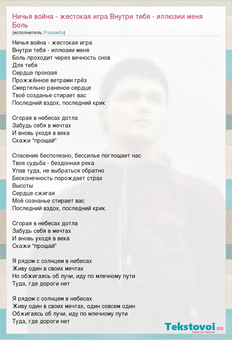 Ничья война - жестокая игра Внутри тебя - иллюзии меня Боль проходит через вечность снов Для тебя Сердце пронзая Прожжённое ветрами грёз Смертельно раненое сердце Твоё созданье стирает вас Последний вздох, последний крик Сгорая в небесах дотла Забудь себя в мечтах И вновь уходя в века Скажи "прощай" Спасение бесполезно, бессилье поглощает нас Твоя судьба - бездонная река Упав туда, не выбраться обратно Бесконечность порождает страх Высоты Сердце сжигая Моё сознанье стирает вас Последний вздох, последний крик Сгорая в небесах дотла Забудь себя в мечтах И вновь уходя в века Скажи "прощай" Я рядом с солнцем в небесах Живу один в своих мечтах Но обжигаясь об лучи, иду по млечному пути Туда, где дороги нет Я рядом с солнцем в небесах Живу один в своих мечтах, один совсем один Обжигаясь об лучи, иду по млечному пути Туда, где дороги нет
