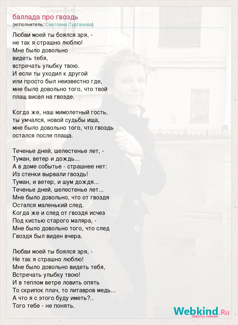 Любви моей ты боялся зря, - не так я страшно люблю! Мне было довольно видеть тебя, встречать улыбку твою. И если ты уходил к другой или просто был неизвестно где, мне было довольно того, что твой плащ висел на гвозде. Когда же, наш мимолетный гость, ты умчался, новой судьбы ища, мне было довольно того, что гвоздь остался после плаща. Теченье дней, шелестенье лет, - Туман, ветер и дождь... А в доме событье - страшнее нет: Из стенки вырвали гвоздь! Туман, и ветер, и шум дождя... Теченье дней, шелестенье лет... Мне было довольно, что от гвоздя Остался маленький след. Когда же и след от гвоздя исчез Под кистью старого маляра, - Мне было довольно того, что след Гвоздя был виден вчера. Любви моей ты боялся зря, - Не так я страшно люблю! Мне было довольно видеть тебя, Встречать улыбку твою! И в теплом ветре ловить опять То скрипок плач, то литавров медь... А что я с этого буду иметь?.. Того тебе - не понять.