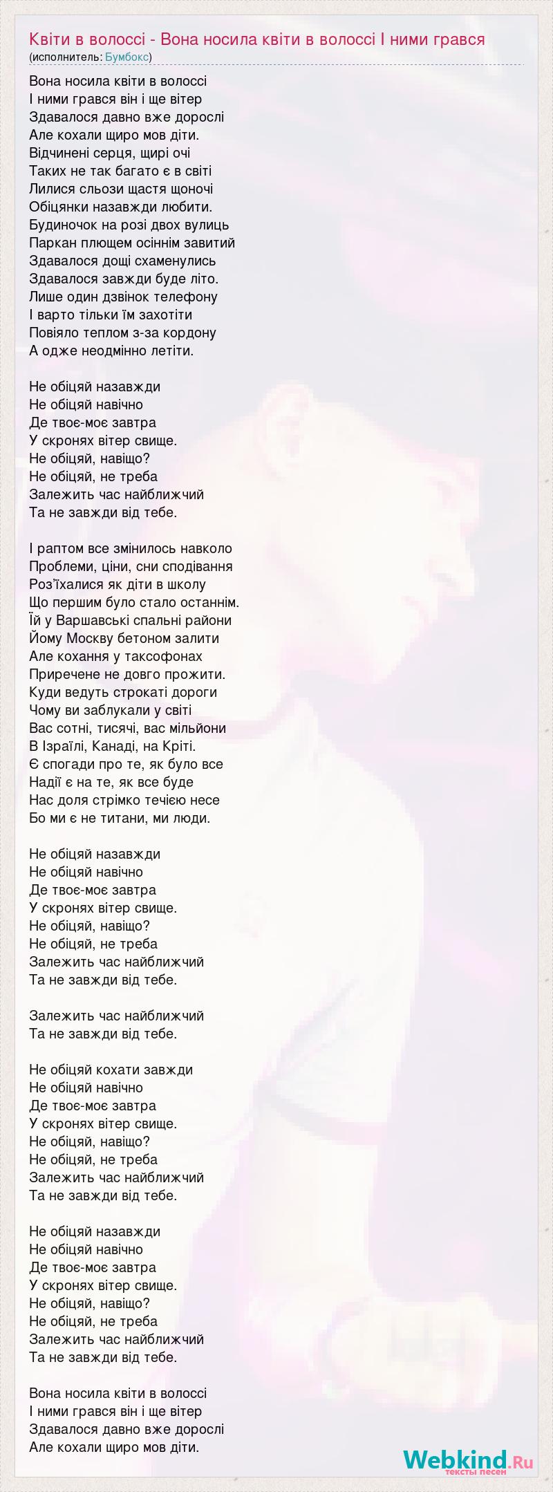 Вона носила квіти в волоссі І ними грався він і ще вітер Здавалося давно вже дорослі Але кохали щиро мов діти. Відчинені серця, щирі очі Таких не так багато є в світі Лилися сльози щастя щоночі Обіцянки назавжди любити. Будиночок на розі двох вулиць Паркан плющем осіннім завитий Здавалося дощі схаменулись Здавалося завжди буде літо. Лише один дзвінок телефону І варто тільки їм захотіти Повіяло теплом з-за кордону А одже неодмінно летіти. Не обіцяй назавжди Не обіцяй навічно Де твоє-моє завтра У скронях вітер свище. Не обіцяй, навіщо? Не обіцяй, не треба Залежить час найближчий Та не завжди від тебе. І раптом все змінилось навколо Проблеми, ціни, сни сподівання Роз’їхалися як діти в школу Що першим було стало останнім. Їй у Варшавські спальні райони Йому Москву бетоном залити Але кохання у таксофонах Приречене не довго прожити. Куди ведуть строкаті дороги Чому ви заблукали у світі Вас сотні, тисячі, вас мільйони В Ізраїлі, Канаді, на Кріті. Є спогади про те, як було все Надії є на те, як все буде Нас доля стрімко течією несе Бо ми є не титани, ми люди. Не обіцяй назавжди Не обіцяй навічно Де твоє-моє завтра У скронях вітер свище. Не обіцяй, навіщо? Не обіцяй, не треба Залежить час найближчий Та не завжди від тебе. Залежить час найближчий Та не завжди від тебе. Не обіцяй кохати завжди Не обіцяй навічно Де твоє-моє завтра У скронях вітер свище. Не обіцяй, навіщо? Не обіцяй, не треба Залежить час найближчий Та не завжди від тебе. Не обіцяй назавжди Не обіцяй навічно Де твоє-моє завтра У скронях вітер свище. Не обіцяй, навіщо? Не обіцяй, не треба Залежить час найближчий Та не завжди від тебе. Вона носила квіти в волоссі І ними грався він і ще вітер Здавалося давно вже дорослі Але кохали щиро мов діти.