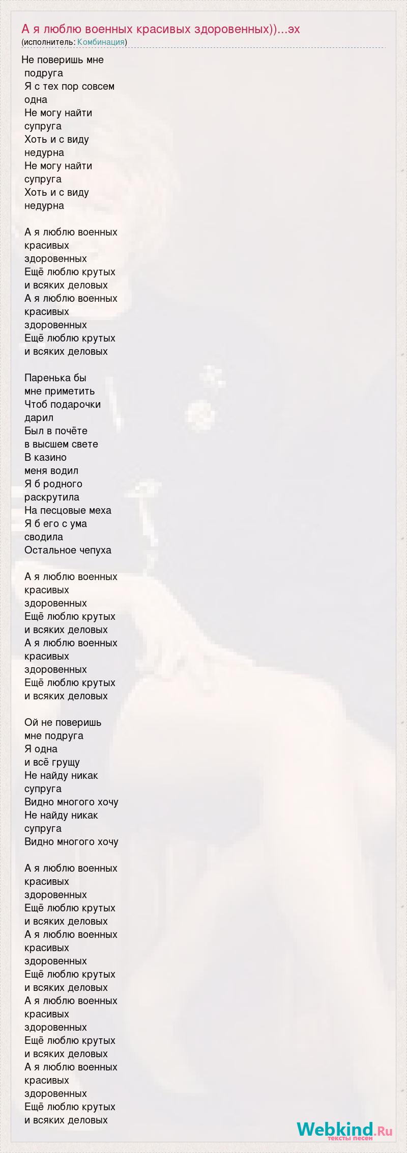 Не поверишь мне подруга Я с тех пор совсем одна Не могу найти супруга Хоть и с виду недурна Не могу найти супруга Хоть и с виду недурна А я люблю военных красивых здоровенных Ещё люблю крутых и всяких деловых А я люблю военных красивых здоровенных Ещё люблю крутых и всяких деловых Паренька бы мне приметить Чтоб подарочки дарил Был в почёте в высшем свете В казино меня водил Я б родного раскрутила На песцовые меха Я б его с ума сводила Остальное чепуха А я люблю военных красивых здоровенных Ещё люблю крутых и всяких деловых А я люблю военных красивых здоровенных Ещё люблю крутых и всяких деловых Ой не поверишь мне подруга Я одна и всё грущу Не найду никак супруга Видно многого хочу Не найду никак супруга Видно многого хочу А я люблю военных красивых здоровенных Ещё люблю крутых и всяких деловых А я люблю военных красивых здоровенных Ещё люблю крутых и всяких деловых А я люблю военных красивых здоровенных Ещё люблю крутых и всяких деловых А я люблю военных красивых здоровенных Ещё люблю крутых и всяких деловых