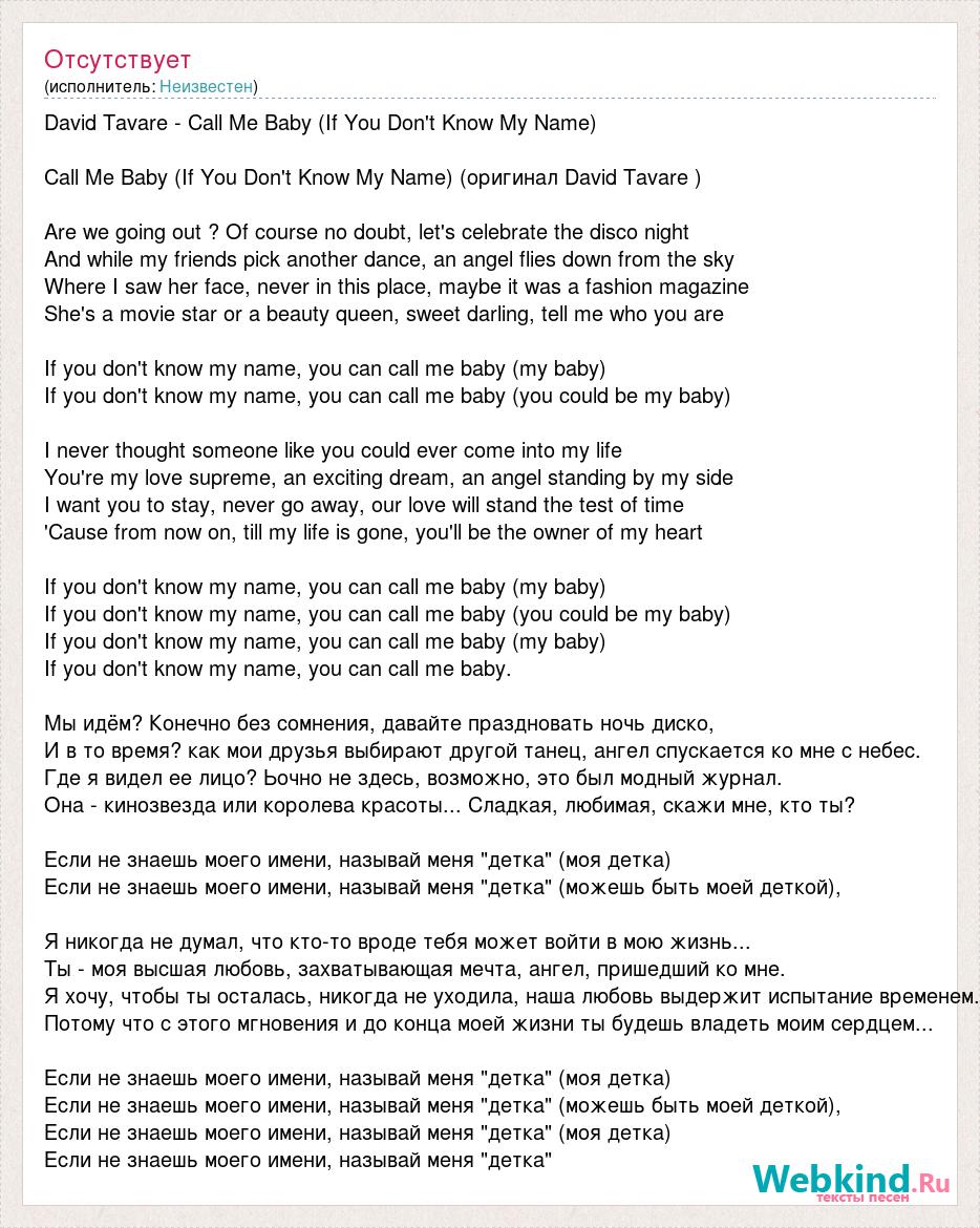 David Tavare - Call Me Baby (If You Don't Know My Name) Call Me Baby (If You Don't Know My Name) (оригинал David Tavare ) Are we going out ? Of course no doubt, let's celebrate the disco night And while my friends pick another dance, an angel flies down from the sky Where I saw her face, never in this place, maybe it was a fashion magazine She's a movie star or a beauty queen, sweet darling, tell me who you are If you don't know my name, you can call me baby (my baby) If you don't know my name, you can call me baby (you could be my baby) I never thought someone like you could ever come into my life You're my love supreme, an exciting dream, an angel standing by my side I want you to stay, never go away, our love will stand the test of time 'Cause from now on, till my life is gone, you'll be the owner of my heart If you don't know my name, you can call me baby (my baby) If you don't know my name, you can call me baby (you could be my baby) If you don't know my name, you can call me baby (my baby) If you don't know my name, you can call me baby. Мы идём? Конечно без сомнения, давайте праздновать ночь диско, И в то время? как мои друзья выбирают другой танец, ангел спускается ко мне с небес. Где я видел ее лицо? Ьочно не здесь, возможно, это был модный журнал. Она - кинозвезда или королева красоты... Сладкая, любимая, скажи мне, кто ты? Если не знаешь моего имени, называй меня "детка" (моя детка) Если не знаешь моего имени, называй меня "детка" (можешь быть моей деткой), Я никогда не думал, что кто-то вроде тебя может войти в мою жизнь... Ты - моя высшая любовь, захватывающая мечта, ангел, пришедший ко мне. Я хочу, чтобы ты осталась, никогда не уходила, наша любовь выдержит испытание временем. Потому что с этого мгновения и до конца моей жизни ты будешь владеть моим сердцем... Если не знаешь моего имени, называй меня "детка" (моя детка) Если не знаешь моего имени, называй меня "детка" (можешь быть моей деткой), Если не знаешь моего имени, называй меня "детка" (моя детка) Если не знаешь моего имени, называй меня "детка"