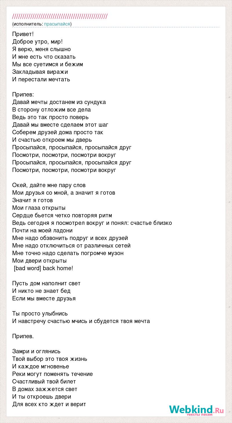 Привет! Доброе утро, мир! Я верю, меня слышно И мне есть что сказать Мы все суетимся и бежим Закладывая виражи И перестали мечтать Припев: Давай мечты достанем из сундука В сторону отложим все дела Ведь это так просто поверь Давай мы вместе сделаем этот шаг Соберем друзей дома просто так И счастью откроем мы дверь Просыпайся, просыпайся, просыпайся друг Посмотри, посмотри, посмотри вокруг Просыпайся, просыпайся, просыпайся друг Посмотри, посмотри, посмотри вокруг Окей, дайте мне пару слов Мои друзья со мной, а значит я готов Значит я готов Мои глаза открыты Сердце бьется четко повторяя ритм Ведь сегодня я посмотрел вокруг и понял: счастье близко Почти на моей ладони Мне надо обзвонить подруг и всех друзей Мне надо отключиться от различных сетей Мне точно надо сделать погромче музон Мои двери открыты [bad word] back home! Пусть дом наполнит свет И никто не знает бед Если мы вместе друзья Ты просто улыбнись И навстречу счастью мчись и сбудется твоя мечта Припев. Замри и оглянись Твой выбор это твоя жизнь И каждое мгновенье Реки могут поменять течение Счастливый твой билет В домах зажжется свет И ты откроешь двери Для всех кто ждет и верит