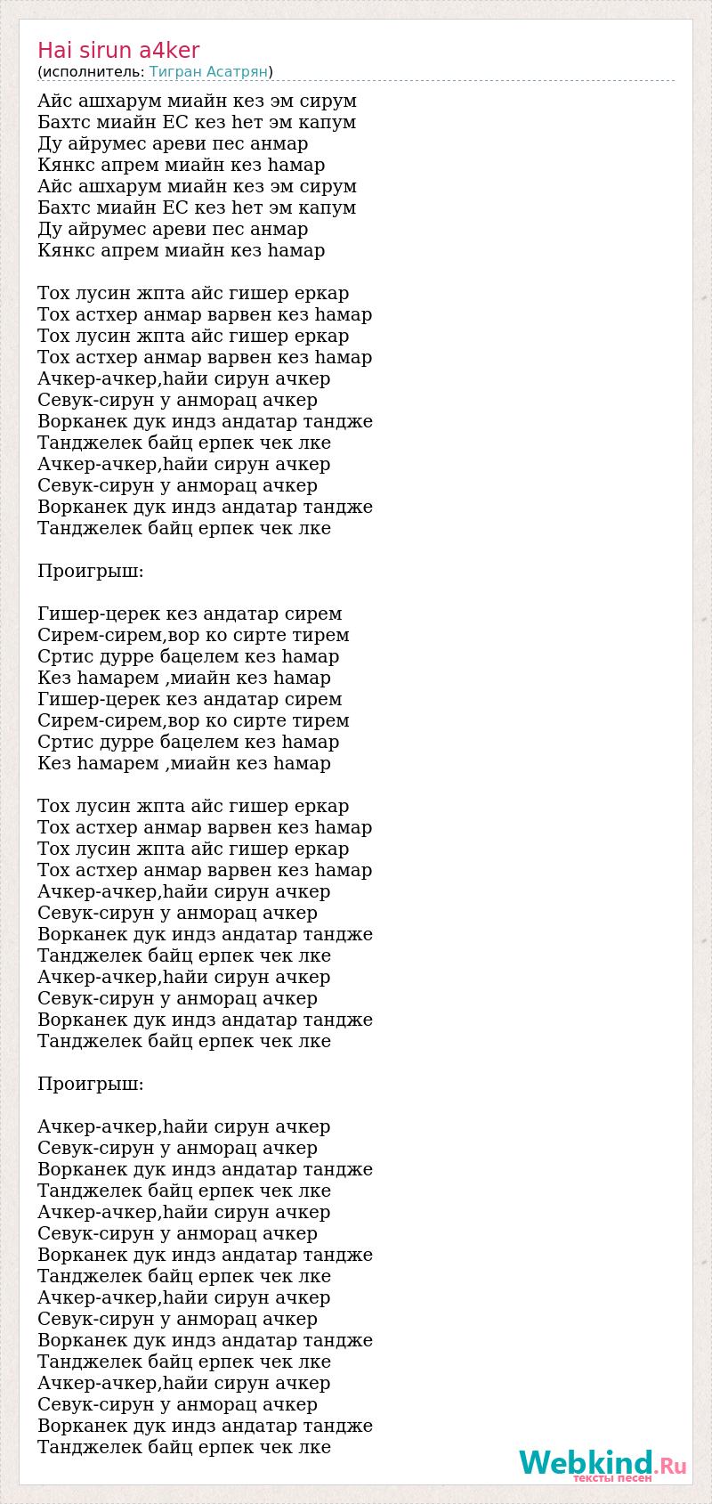 Айс ашхарум миайн кез эм сирум Бахтс миайн ЕС кез hет эм капум Ду айрумес ареви пес анмар Кянкс апрем миайн кез hамар Айс ашхарум миайн кез эм сирум Бахтс миайн ЕС кез hет эм капум Ду айрумес ареви пес анмар Кянкс апрем миайн кез hамар Тох лусин жпта айс гишер еркар Тох астхер анмар варвен кез hамар Тох лусин жпта айс гишер еркар Тох астхер анмар варвен кез hамар Ачкер-ачкер,hайи сирун ачкер Севук-сирун у анморац ачкер Ворканек дук индз андатар тандже Танджелек байц ерпек чек лке Ачкер-ачкер,hайи сирун ачкер Севук-сирун у анморац ачкер Ворканек дук индз андатар тандже Танджелек байц ерпек чек лке Проигрыш: Гишер-церек кез андатар сирем Сирем-сирем,вор ко сирте тирем Сртис дурре бацелем кез hамар Кез hамарем ,миайн кез hамар Гишер-церек кез андатар сирем Сирем-сирем,вор ко сирте тирем Сртис дурре бацелем кез hамар Кез hамарем ,миайн кез hамар Тох лусин жпта айс гишер еркар Тох астхер анмар варвен кез hамар Тох лусин жпта айс гишер еркар Тох астхер анмар варвен кез hамар Ачкер-ачкер,hайи сирун ачкер Севук-сирун у анморац ачкер Ворканек дук индз андатар тандже Танджелек байц ерпек чек лке Ачкер-ачкер,hайи сирун ачкер Севук-сирун у анморац ачкер Ворканек дук индз андатар тандже Танджелек байц ерпек чек лке Проигрыш: Ачкер-ачкер,hайи сирун ачкер Севук-сирун у анморац ачкер Ворканек дук индз андатар тандже Танджелек байц ерпек чек лке Ачкер-ачкер,hайи сирун ачкер Севук-сирун у анморац ачкер Ворканек дук индз андатар тандже Танджелек байц ерпек чек лке Ачкер-ачкер,hайи сирун ачкер Севук-сирун у анморац ачкер Ворканек дук индз андатар тандже Танджелек байц ерпек чек лке Ачкер-ачкер,hайи сирун ачкер Севук-сирун у анморац ачкер Ворканек дук индз андатар тандже Танджелек байц ерпек чек лке
