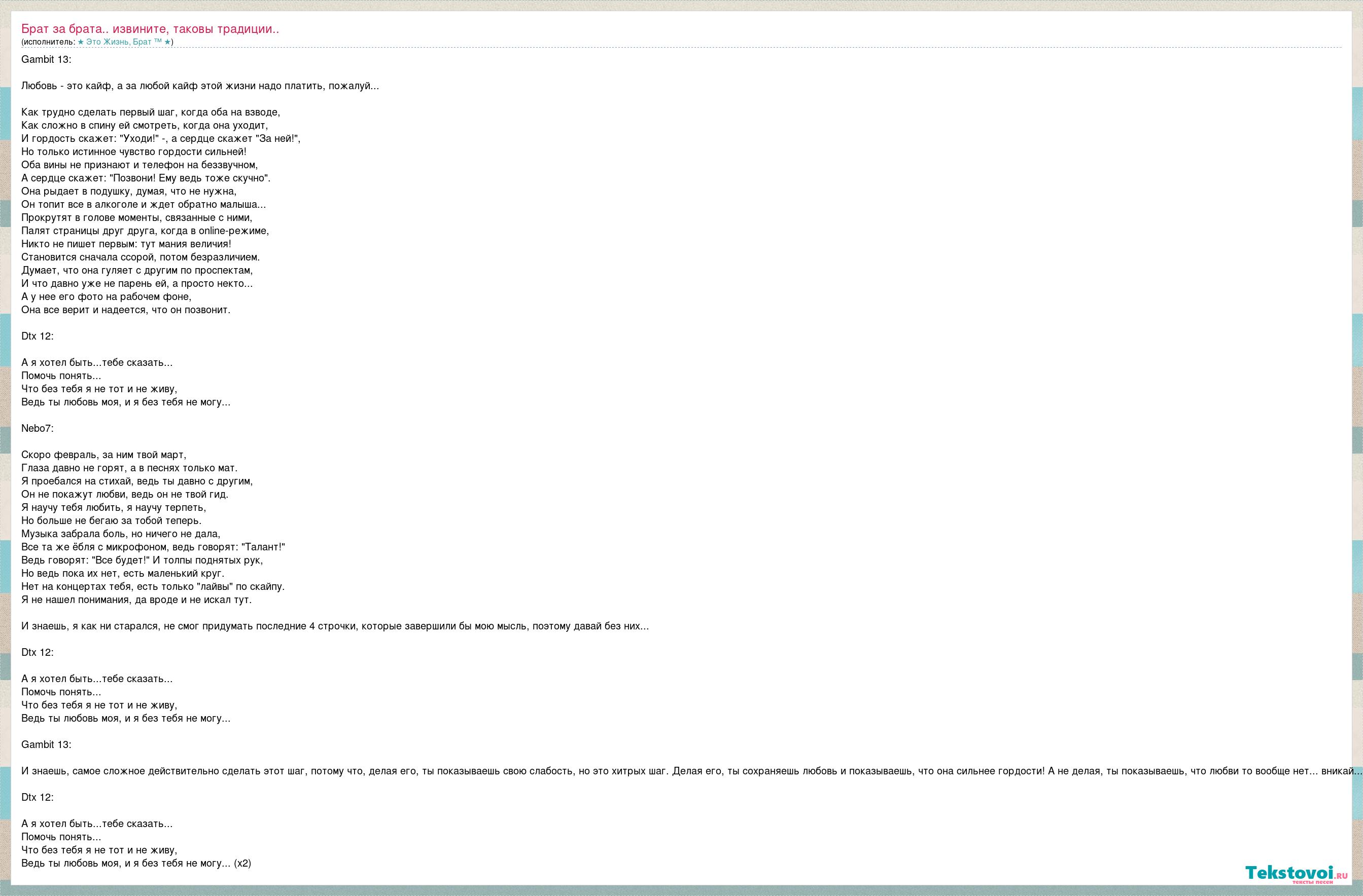 Gambit 13: Любовь - это кайф, а за любой кайф этой жизни надо платить, пожалуй... Как трудно сделать первый шаг, когда оба на взводе, Как сложно в спину ей смотреть, когда она уходит, И гордость скажет: "Уходи!" -, а сердце скажет "За ней!", Но только истинное чувство гордости сильней! Оба вины не признают и телефон на беззвучном, А сердце скажет: "Позвони! Ему ведь тоже скучно". Она рыдает в подушку, думая, что не нужна, Он топит все в алкоголе и ждет обратно малыша... Прокрутят в голове моменты, связанные с ними, Палят страницы друг друга, когда в online-режиме, Никто не пишет первым: тут мания величия! Становится сначала ссорой, потом безразличием. Думает, что она гуляет с другим по проспектам, И что давно уже не парень ей, а просто некто... А у нее его фото на рабочем фоне, Она все верит и надеется, что он позвонит. Dtx 12: А я хотел быть...тебе сказать... Помочь понять... Что без тебя я не тот и не живу, Ведь ты любовь моя, и я без тебя не могу... Nebo7: Скоро февраль, за ним твой март, Глаза давно не горят, а в песнях только мат. Я проебался на стихай, ведь ты давно с другим, Он не покажут любви, ведь он не твой гид. Я научу тебя любить, я научу терпеть, Но больше не бегаю за тобой теперь. Музыка забрала боль, но ничего не дала, Все та же ёбля с микрофоном, ведь говорят: "Талант!" Ведь говорят: "Все будет!" И толпы поднятых рук, Но ведь пока их нет, есть маленький круг. Нет на концертах тебя, есть только "лайвы" по скайпу. Я не нашел понимания, да вроде и не искал тут. И знаешь, я как ни старался, не смог придумать последние 4 строчки, которые завершили бы мою мысль, поэтому давай без них... Dtx 12: А я хотел быть...тебе сказать... Помочь понять... Что без тебя я не тот и не живу, Ведь ты любовь моя, и я без тебя не могу... Gambit 13: И знаешь, самое сложное действительно сделать этот шаг, потому что, делая его, ты показываешь свою слабость, но это хитрых шаг. Делая его, ты сохраняешь любовь и показываешь, что она сильнее гордости! А не делая, ты показываешь, что любви то вообще нет... вникай... Dtx 12: А я хотел быть...тебе сказать... Помочь понять... Что без тебя я не тот и не живу, Ведь ты любовь моя, и я без тебя не могу... (х2)