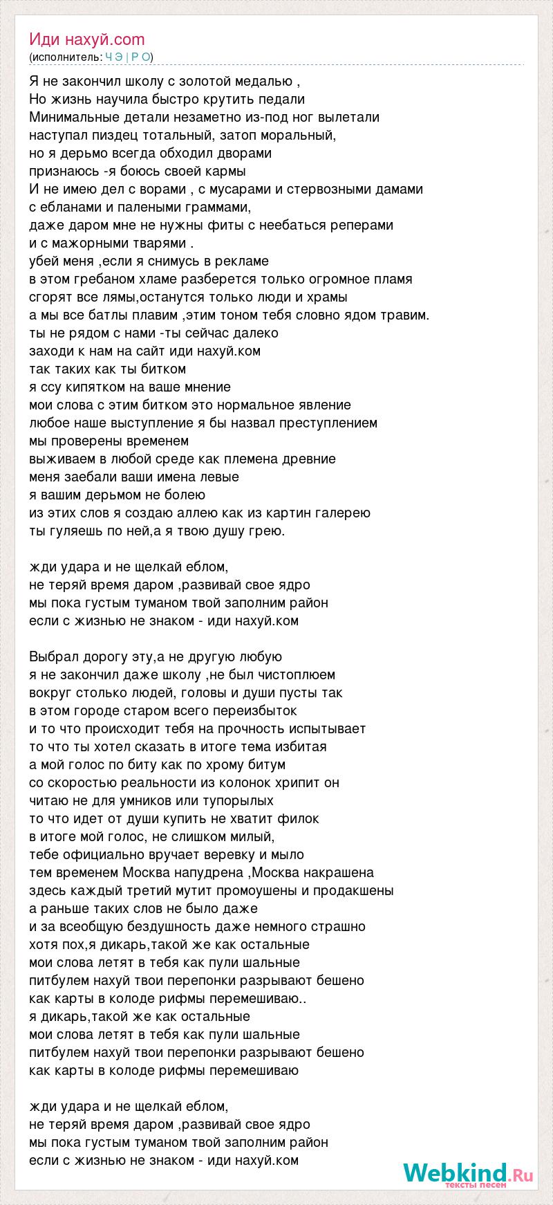 Я не закончил школу с золотой медалью , Но жизнь научила быстро крутить педали Минимальные детали незаметно из-под ног вылетали наступал пиздец тотальный, затоп моральный, но я дерьмо всегда обходил дворами признаюсь -я боюсь своей кармы И не имею дел с ворами , с мусарами и стервозными дамами с ебланами и палеными граммами, даже даром мне не нужны фиты с неебаться реперами и с мажорными тварями . убей меня ,если я снимусь в рекламе в этом гребаном хламе разберется только огромное пламя сгорят все лямы,останутся только люди и храмы а мы все батлы плавим ,этим тоном тебя словно ядом травим. ты не рядом с нами -ты сейчас далеко заходи к нам на сайт иди нахуй.ком так таких как ты битком я ссу кипятком на ваше мнение мои слова с этим битком это нормальное явление любое наше выступление я бы назвал преступлением мы проверены временем выживаем в любой среде как племена древние меня заебали ваши имена левые я вашим дерьмом не болею из этих слов я создаю аллею как из картин галерею ты гуляешь по ней,а я твою душу грею. жди удара и не щелкай еблом, не теряй время даром ,развивай свое ядро мы пока густым туманом твой заполним район если с жизнью не знаком - иди нахуй.ком Выбрал дорогу эту,а не другую любую я не закончил даже школу ,не был чистоплюем вокруг столько людей, головы и души пусты так в этом городе старом всего переизбыток и то что происходит тебя на прочность испытывает то что ты хотел сказать в итоге тема избитая а мой голос по биту как по хрому битум со скоростью реальности из колонок хрипит он читаю не для умников или тупорылых то что идет от души купить не хватит филок в итоге мой голос, не слишком милый, тебе официально вручает веревку и мыло тем временем Москва напудрена ,Москва накрашена здесь каждый третий мутит промоушены и продакшены а раньше таких слов не было даже и за всеобщую бездушность даже немного страшно хотя пох,я дикарь,такой же как остальные мои слова летят в тебя как пули шальные питбулем нахуй твои перепонки разрывают бешено как карты в колоде рифмы перемешиваю.. я дикарь,такой же как остальные мои слова летят в тебя как пули шальные питбулем нахуй твои перепонки разрывают бешено как карты в колоде рифмы перемешиваю жди удара и не щелкай еблом, не теряй время даром ,развивай свое ядро мы пока густым туманом твой заполним район если с жизнью не знаком - иди нахуй.ком