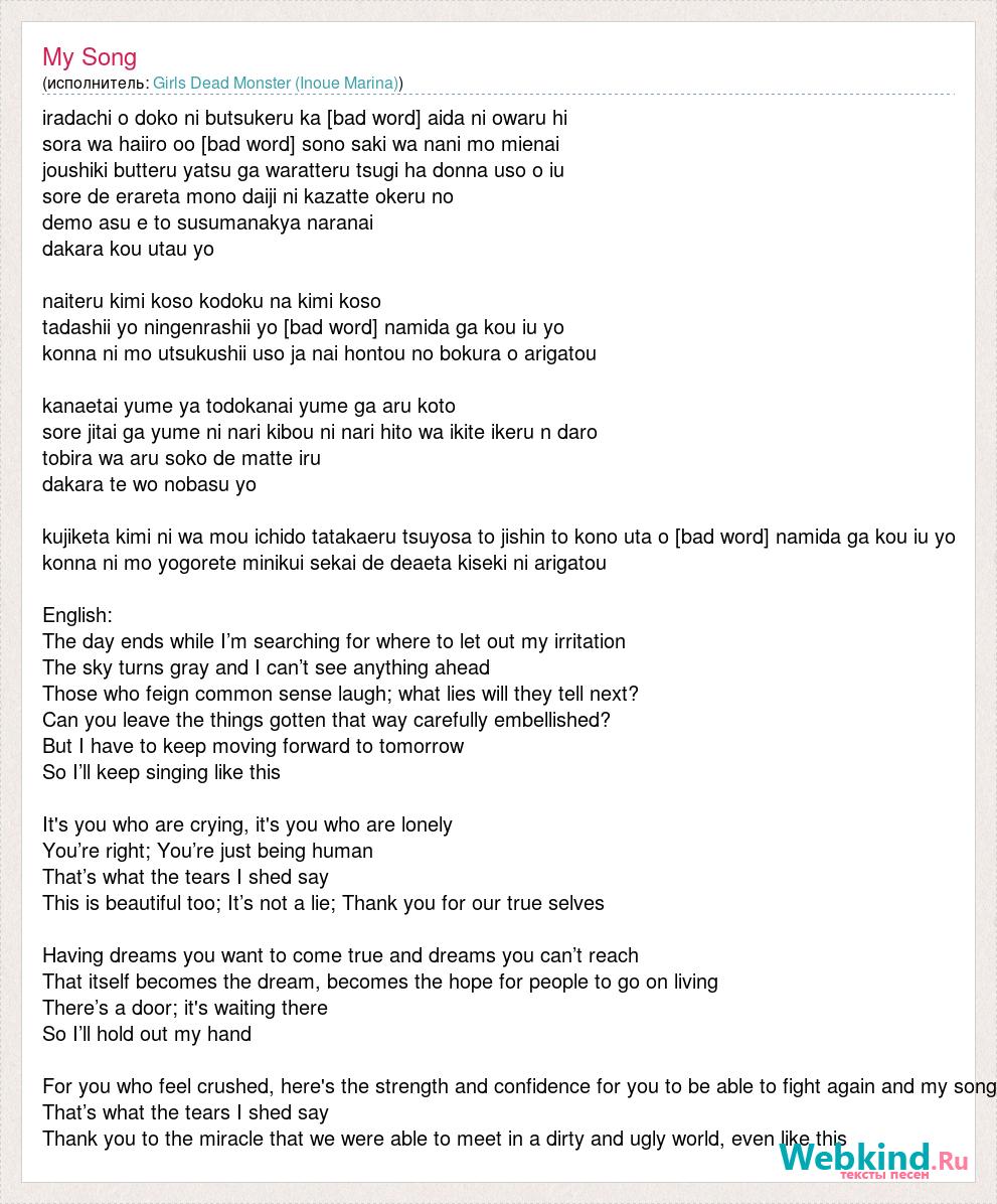 iradachi o doko ni butsukeru ka [bad word] aida ni owaru hi sora wa haiiro oo [bad word] sono saki wa nani mo mienai joushiki butteru yatsu ga waratteru tsugi ha donna uso o iu sore de erareta mono daiji ni kazatte okeru no demo asu e to susumanakya naranai dakara kou utau yo naiteru kimi koso kodoku na kimi koso tadashii yo ningenrashii yo [bad word] namida ga kou iu yo konna ni mo utsukushii uso ja nai hontou no bokura o arigatou kanaetai yume ya todokanai yume ga aru koto sore jitai ga yume ni nari kibou ni nari hito wa ikite ikeru n daro tobira wa aru soko de matte iru dakara te wo nobasu yo kujiketa kimi ni wa mou ichido tatakaeru tsuyosa to jishin to kono uta o [bad word] namida ga kou iu yo konna ni mo yogorete minikui sekai de deaeta kiseki ni arigatou English: The day ends while I’m searching for where to let out my irritation The sky turns gray and I can’t see anything ahead Those who feign common sense laugh; what lies will they tell next? Can you leave the things gotten that way carefully embellished? But I have to keep moving forward to tomorrow So I’ll keep singing like this It's you who are crying, it's you who are lonely You’re right; You’re just being human That’s what the tears I shed say This is beautiful too; It’s not a lie; Thank you for our true selves Having dreams you want to come true and dreams you can’t reach That itself becomes the dream, becomes the hope for people to go on living There’s a door; it's waiting there So I’ll hold out my hand For you who feel crushed, here's the strength and confidence for you to be able to fight again and my song That’s what the tears I shed say Thank you to the miracle that we were able to meet in a dirty and ugly world, even like this