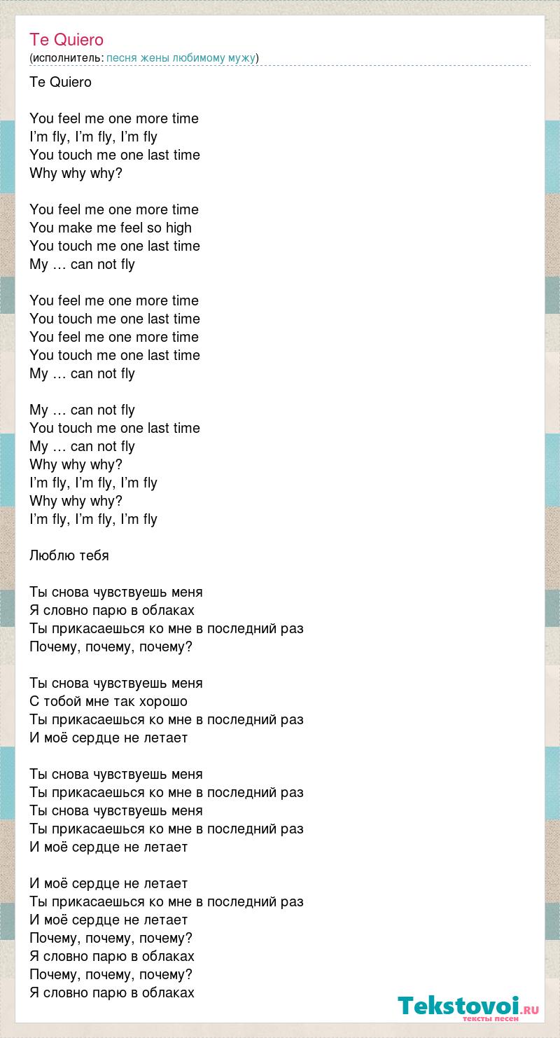 Te Quiero You feel me one more time I’m fly, I’m fly, I’m fly You touch me one last time Why why why? You feel me one more time You make me feel so high You touch me one last time My … can not fly You feel me one more time You touch me one last time You feel me one more time You touch me one last time My … can not fly My … can not fly You touch me one last time My … can not fly Why why why? I’m fly, I’m fly, I’m fly Why why why? I’m fly, I’m fly, I’m fly Люблю тебя Ты снова чувствуешь меня Я словно парю в облаках Ты прикасаешься ко мне в последний раз Почему, почему, почему? Ты снова чувствуешь меня С тобой мне так хорошо Ты прикасаешься ко мне в последний раз И моё сердце не летает Ты снова чувствуешь меня Ты прикасаешься ко мне в последний раз Ты снова чувствуешь меня Ты прикасаешься ко мне в последний раз И моё сердце не летает И моё сердце не летает Ты прикасаешься ко мне в последний раз И моё сердце не летает Почему, почему, почему? Я словно парю в облаках Почему, почему, почему? Я словно парю в облаках