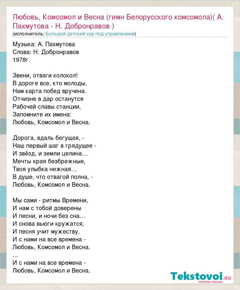 Музыка: А. Пахмутова Слова: Н. Добронравов 1978г. Звени, отваги колокол! В дороге все, кто молоды, Нам карта побед вручена. Отчизне в дар останутся Рабочей славы станции, Запомните их имена: Любовь, Комсомол и Весна. Дорога, вдаль бегущая, - Наш первый шаг в грядущее - И звёзд, и земли целина… Мечты края безбрежные, Твоя улыбка нежная… В душе, что отвагой полна, - Любовь, Комсомол и Весна. Мы сами - ритмы Времени, И нам с тобой доверены И песни, и ночи без сна… И снова вьюги кружатся, И песня учит мужеству, И с нами на все времена - Любовь, Комсомол и Весна. ... И с нами на все времена - Любовь, Комсомол и Весна.