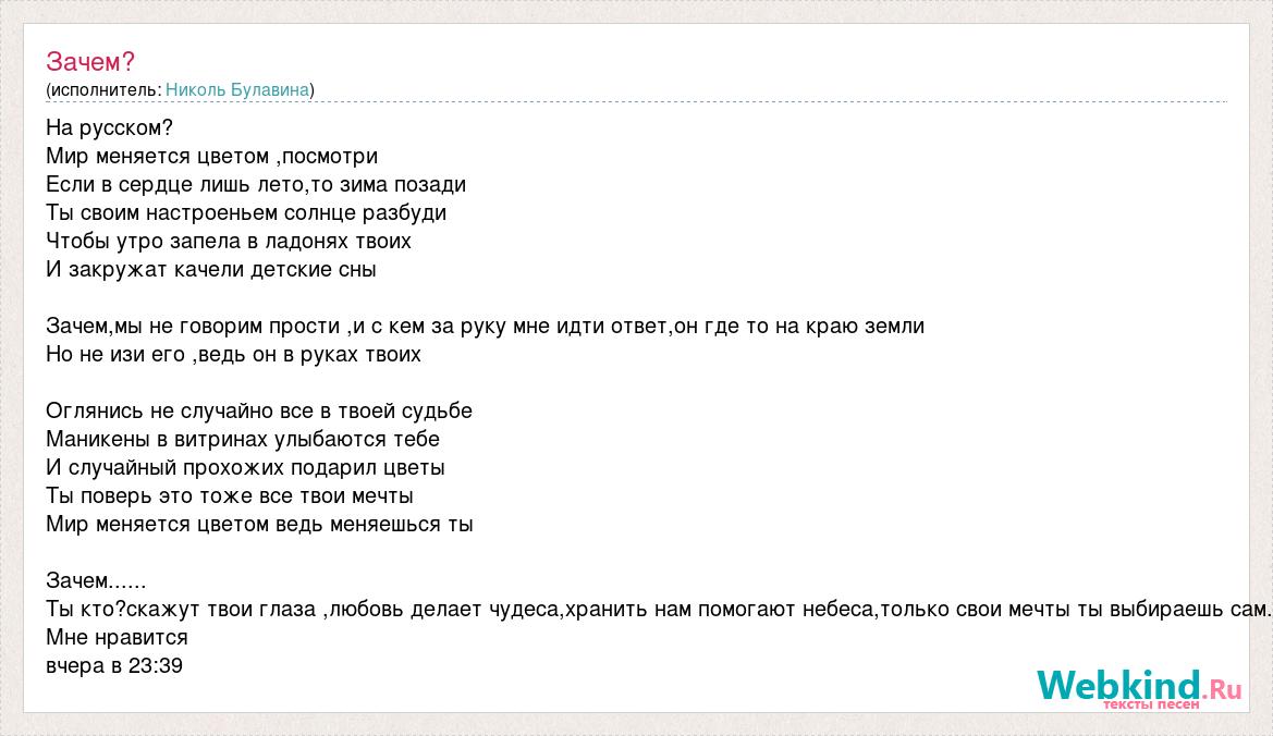 На русском? Мир меняется цветом ,посмотри Если в сердце лишь лето,то зима позади Ты своим настроеньем солнце разбуди Чтобы утро запела в ладонях твоих И закружат качели детские сны Зачем,мы не говорим прости ,и с кем за руку мне идти ответ,он где то на краю земли Но не изи его ,ведь он в руках твоих Оглянись не случайно все в твоей судьбе Маникены в витринах улыбаются тебе И случайный прохожих подарил цветы Ты поверь это тоже все твои мечты Мир меняется цветом ведь меняешься ты Зачем...... Ты кто?скажут твои глаза ,любовь делает чудеса,хранить нам помогают небеса,только свои мечты ты выбираешь сам. Мне нравится вчера в 23:39