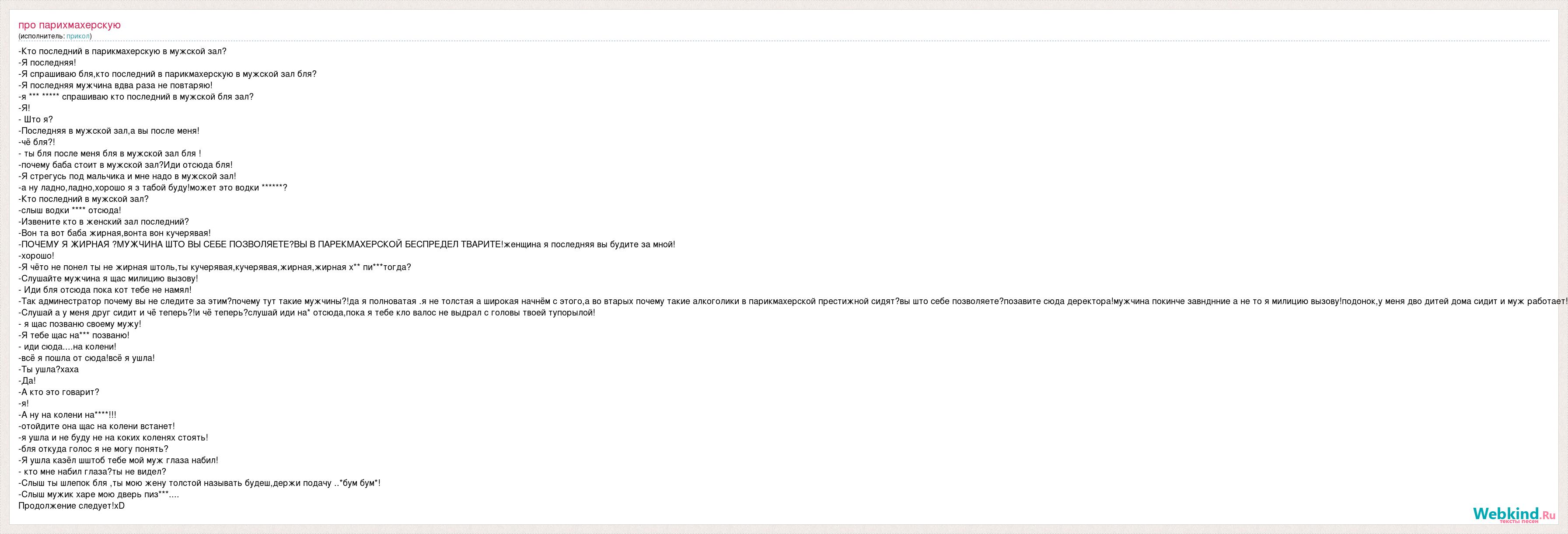 -Кто последний в парикмахерскую в мужской зал? -Я последняя! -Я спрашиваю бля,кто последний в парикмахерскую в мужской зал бля? -Я последняя мужчина вдва раза не повтаряю! -я *** ***** спрашиваю кто последний в мужской бля зал? -Я! - Што я? -Последняя в мужской зал,а вы после меня! -чё бля?! - ты бля после меня бля в мужской зал бля ! -почему баба стоит в мужской зал?Иди отсюда бля! -Я стрегусь под мальчика и мне надо в мужской зал! -а ну ладно,ладно,хорошо я з табой буду!может это водки ******? -Кто последний в мужской зал? -слыш водки **** отсюда! -Извените кто в женский зал последний? -Вон та вот баба жирная,вонта вон кучерявая! -ПОЧЕМУ Я ЖИРНАЯ ?МУЖЧИНА ШТО ВЫ СЕБЕ ПОЗВОЛЯЕТЕ?ВЫ В ПАРЕКМАХЕРСКОЙ БЕСПРЕДЕЛ ТВАРИТЕ!женщина я последняя вы будите за мной! -хорошо! -Я чёто не понел ты не жирная штоль,ты кучерявая,кучерявая,жирная,жирная х** пи***тогда? -Слушайте мужчина я щас милицию вызову! - Иди бля отсюда пока кот тебе не намял! -Так админестратор почему вы не следите за этим?почему тут такие мужчины?!да я полноватая .я не толстая а широкая начнём с этого,а во втарых почему такие алкоголики в парикмахерской престижной сидят?вы што себе позволяете?позавите сюда деректора!мужчина покинче завнднние а не то я милицию вызову!подонок,у меня дво дитей дома сидит и муж работает! -Слушай а у меня друг сидит и чё теперь?!и чё теперь?слушай иди на* отсюда,пока я тебе кло валос не выдрал с головы твоей тупорылой! - я щас позваню своему мужу! -Я тебе щас на*** позваню! - иди сюда....на колени! -всё я пошла от сюда!всё я ушла! -Ты ушла?хаха -Да! -А кто это говарит? -я! -А ну на колени на****!!! -отойдите она щас на колени встанет! -я ушла и не буду не на коких коленях стоять! -бля откуда голос я не могу понять? -Я ушла казёл шштоб тебе мой муж глаза набил! - кто мне набил глаза?ты не видел? -Слыш ты шлепок бля ,ты мою жену толстой называть будеш,держи подачу ..*бум бум*! -Слыш мужик харе мою дверь пиз***.... Продолжение следует!xD