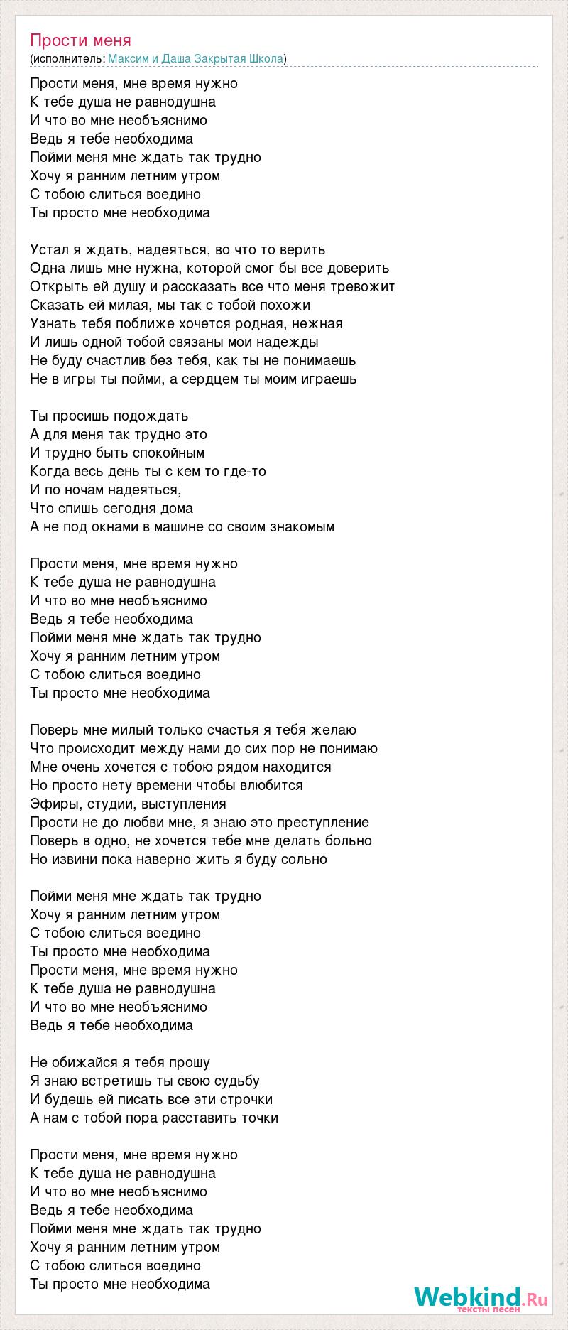 Прости меня, мне время нужно К тебе душа не равнодушна И что во мне необъяснимо Ведь я тебе необходима Пойми меня мне ждать так трудно Хочу я ранним летним утром С тобою слиться воедино Ты просто мне необходима Устал я ждать, надеяться, во что то верить Одна лишь мне нужна, которой смог бы все доверить Открыть ей душу и рассказать все что меня тревожит Сказать ей милая, мы так с тобой похожи Узнать тебя поближе хочется родная, нежная И лишь одной тобой связаны мои надежды Не буду счастлив без тебя, как ты не понимаешь Не в игры ты пойми, а сердцем ты моим играешь Ты просишь подождать А для меня так трудно это И трудно быть спокойным Когда весь день ты с кем то где-то И по ночам надеяться, Что спишь сегодня дома А не под окнами в машине со своим знакомым Прости меня, мне время нужно К тебе душа не равнодушна И что во мне необъяснимо Ведь я тебе необходима Пойми меня мне ждать так трудно Хочу я ранним летним утром С тобою слиться воедино Ты просто мне необходима Поверь мне милый только счастья я тебя желаю Что происходит между нами до сих пор не понимаю Мне очень хочется с тобою рядом находится Но просто нету времени чтобы влюбится Эфиры, студии, выступления Прости не до любви мне, я знаю это преступление Поверь в одно, не хочется тебе мне делать больно Но извини пока наверно жить я буду сольно Пойми меня мне ждать так трудно Хочу я ранним летним утром С тобою слиться воедино Ты просто мне необходима Прости меня, мне время нужно К тебе душа не равнодушна И что во мне необъяснимо Ведь я тебе необходима Не обижайся я тебя прошу Я знаю встретишь ты свою судьбу И будешь ей писать все эти строчки А нам с тобой пора расставить точки Прости меня, мне время нужно К тебе душа не равнодушна И что во мне необъяснимо Ведь я тебе необходима Пойми меня мне ждать так трудно Хочу я ранним летним утром С тобою слиться воедино Ты просто мне необходима
