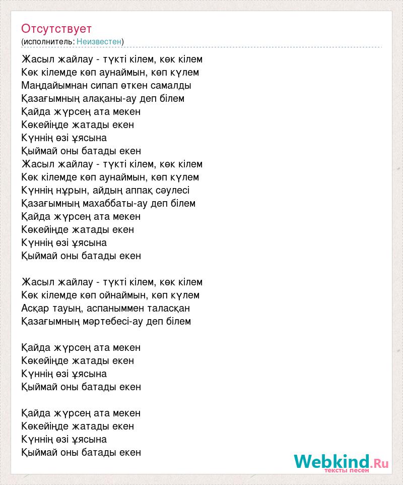 Жасыл жайлау - түкті кілем, көк кілем Көк кілемде көп аунаймын, көп күлем Маңдайымнан сипап өткен самалды Қазағымның алақаны-ау деп білем Қайда жүрсең ата мекен Көкейіңде жатады екен Күннің өзі ұясына Қыймай оны батады екен Жасыл жайлау - түкті кілем, көк кілем Көк кілемде көп аунаймын, көп күлем Күннің нұрын, айдың аппақ сәулесі Қазағымның махаббаты-ау деп білем Қайда жүрсең ата мекен Көкейіңде жатады екен Күннің өзі ұясына Қыймай оны батады екен Жасыл жайлау - түкті кілем, көк кілем Көк кілемде көп ойнаймын, көп күлем Асқар тауың, аспаныммен таласқан Қазағымның мәртебесі-ау деп білем Қайда жүрсең ата мекен Көкейіңде жатады екен Күннің өзі ұясына Қыймай оны батады екен Қайда жүрсең ата мекен Көкейіңде жатады екен Күннің өзі ұясына Қыймай оны батады екен