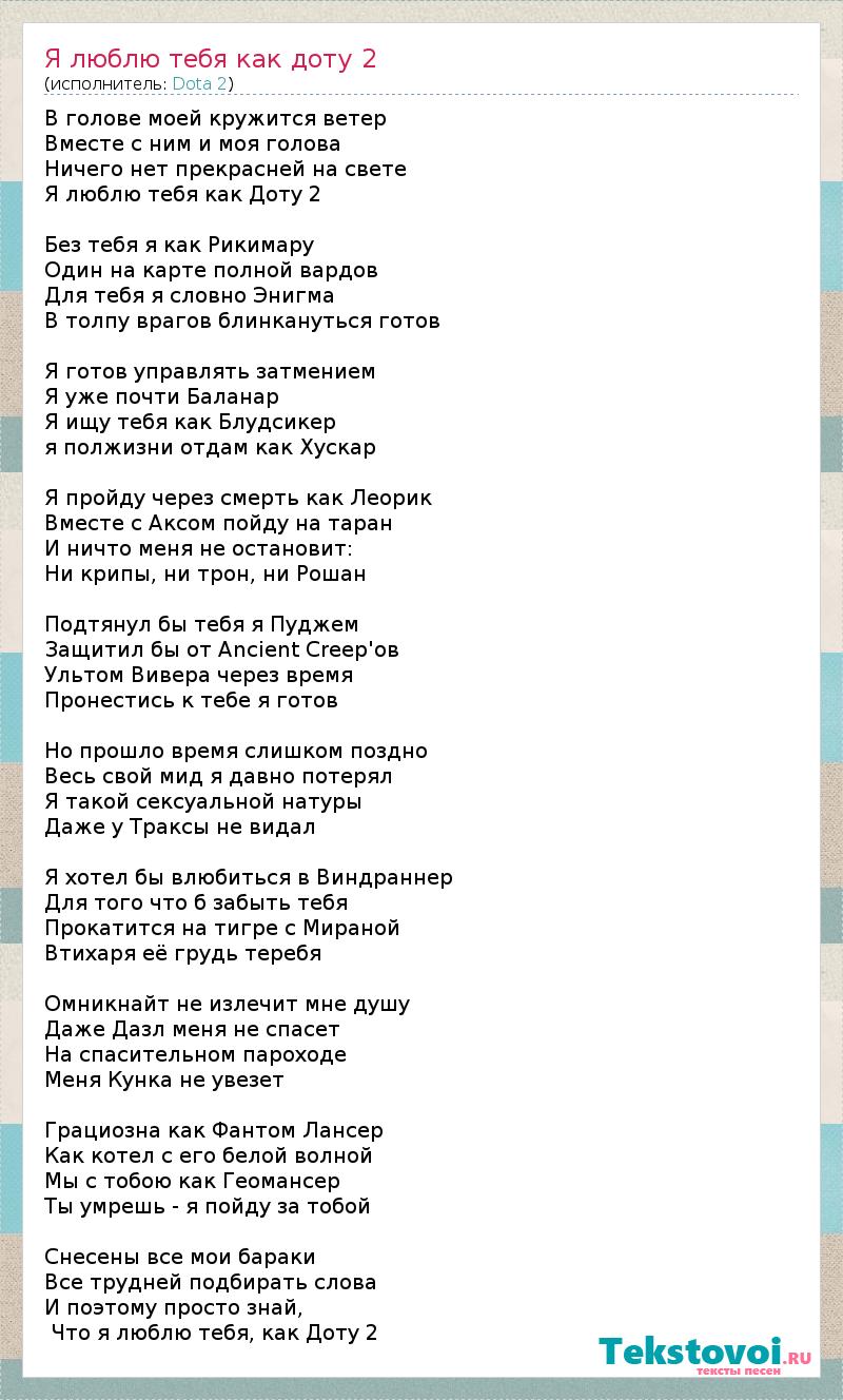 В голове моей кружится ветер Вместе с ним и моя голова Ничего нет прекрасней на свете Я люблю тебя как Доту 2 Без тебя я как Рикимару Один на карте полной вардов Для тебя я словно Энигма В толпу врагов блинкануться готов Я готов управлять затмением Я уже почти Баланар Я ищу тебя как Блудсикер я полжизни отдам как Хускар Я пройду через смерть как Леорик Вместе с Аксом пойду на таран И ничто меня не остановит: Ни крипы, ни трон, ни Рошан Подтянул бы тебя я Пуджем Защитил бы от Ancient Creep'ов Ультом Вивера через время Пронестись к тебе я готов Но прошло время слишком поздно Весь свой мид я давно потерял Я такой сексуальной натуры Даже у Траксы не видал Я хотел бы влюбиться в Виндраннер Для того что б забыть тебя Прокатится на тигре с Мираной Втихаря её грудь теребя Омникнайт не излечит мне душу Даже Дазл меня не спасет На спасительном пароходе Меня Кунка не увезет Грациозна как Фантом Лансер Как котел с его белой волной Мы с тобою как Геомансер Ты умрешь - я пойду за тобой Снесены все мои бараки Все трудней подбирать слова И поэтому просто знай, Что я люблю тебя, как Доту 2