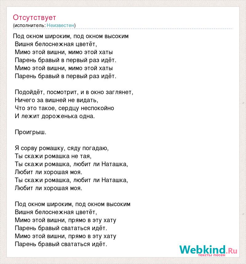 Под окном широким, под окном высоким Вишня белоснежная цветёт, Мимо этой вишни, мимо этой хаты Парень бравый в первый раз идёт. Мимо этой вишни, мимо этой хаты Парень бравый в первый раз идёт. Подойдёт, посмотрит, и в окно заглянет, Ничего за вишней не видать, Что это такое, сердцу неспокойно И лежит дороженька одна. Проигрыш. Я сорву ромашку, сяду погадаю, Ты скажи ромашка не тая, Ты скажи ромашка, любит ли Наташка, Любит ли хорошая моя. Ты скажи ромашка, любит ли Наташка, Любит ли хорошая моя. Под окном широким, под окном высоким Вишня белоснежная цветёт, Мимо этой вишни, прямо в эту хату Парень бравый свататься идёт. Мимо этой вишни, прямо в эту хату Парень бравый свататься идёт.