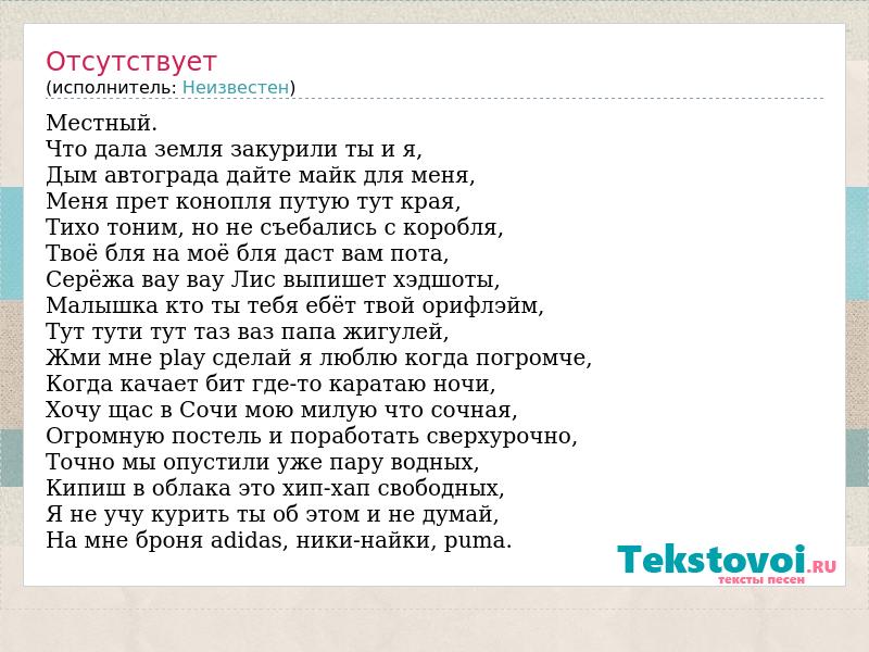 Местный. Что дала земля закурили ты и я, Дым автограда дайте майк для меня, Меня прет конопля путую тут края, Тихо тоним, но не съебались с коробля, Твоё бля на моё бля даст вам пота, Серёжа вау вау Лис выпишет хэдшоты, Малышка кто ты тебя ебёт твой орифлэйм, Тут тути тут таз ваз папа жигулей, Жми мне play сделай я люблю когда погромче, Когда качает бит где-то каратаю ночи, Хочу щас в Сочи мою милую что сочная, Огромную постель и поработать сверхурочно, Точно мы опустили уже пару водных, Кипиш в облака это хип-хап свободных, Я не учу курить ты об этом и не думай, На мне броня adidas, ники-найки, puma.