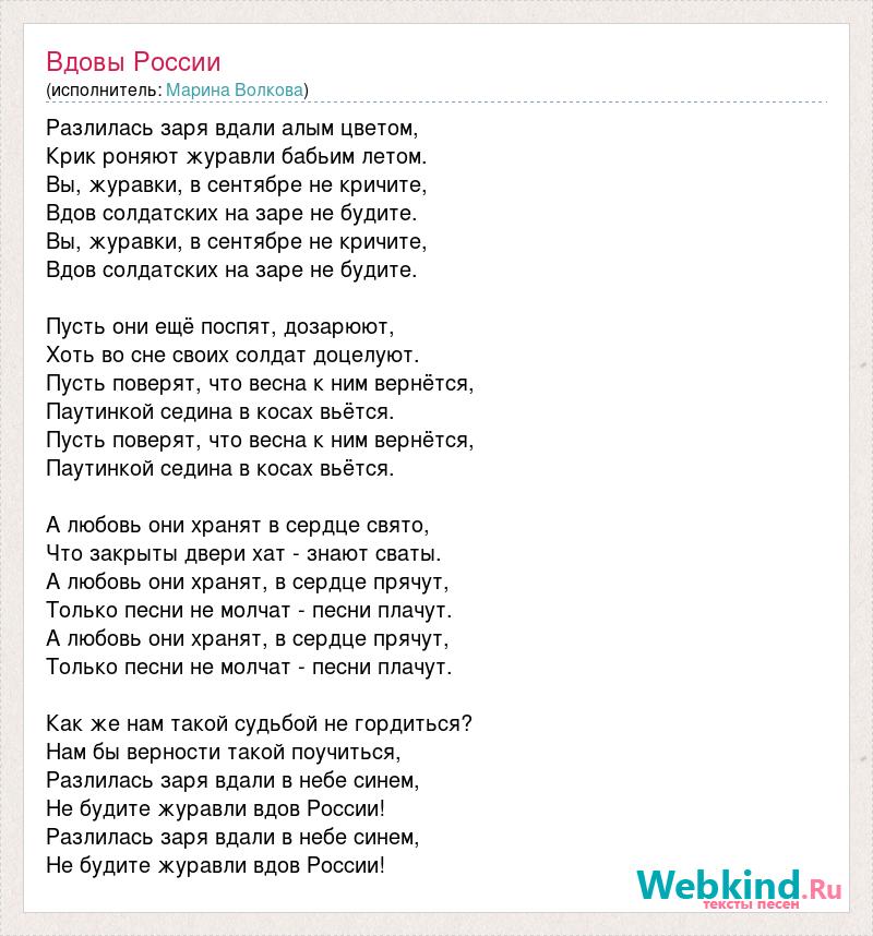Разлилась заря вдали алым цветом, Крик роняют журавли бабьим летом. Вы, журавки, в сентябре не кричите, Вдов солдатских на заре не будите. Вы, журавки, в сентябре не кричите, Вдов солдатских на заре не будите. Пусть они ещё поспят, дозарюют, Хоть во сне своих солдат доцелуют. Пусть поверят, что весна к ним вернётся, Паутинкой седина в косах вьётся. Пусть поверят, что весна к ним вернётся, Паутинкой седина в косах вьётся. А любовь они хранят в сердце свято, Что закрыты двери хат - знают сваты. А любовь они хранят, в сердце прячут, Только песни не молчат - песни плачут. А любовь они хранят, в сердце прячут, Только песни не молчат - песни плачут. Как же нам такой судьбой не гордиться? Нам бы верности такой поучиться, Разлилась заря вдали в небе синем, Не будите журавли вдов России! Разлилась заря вдали в небе синем, Не будите журавли вдов России!