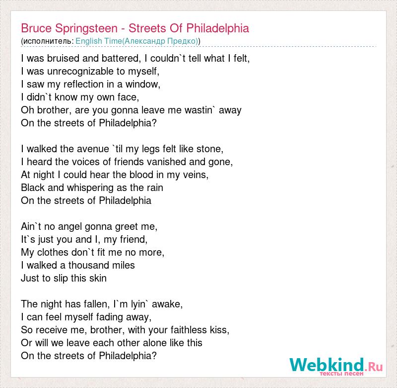 I was bruised and battered, I couldn`t tell what I felt, I was unrecognizable to myself, I saw my reflection in a window, I didn`t know my own face, Oh brother, are you gonna leave me wastin` away On the streets of Philadelphia? I walked the avenue `til my legs felt like stone, I heard the voices of friends vanished and gone, At night I could hear the blood in my veins, Black and whispering as the rain On the streets of Philadelphia Ain`t no angel gonna greet me, It`s just you and I, my friend, My clothes don`t fit me no more, I walked a thousand miles Just to slip this skin The night has fallen, I`m lyin` awake, I can feel myself fading away, So receive me, brother, with your faithless kiss, Or will we leave each other alone like this On the streets of Philadelphia?