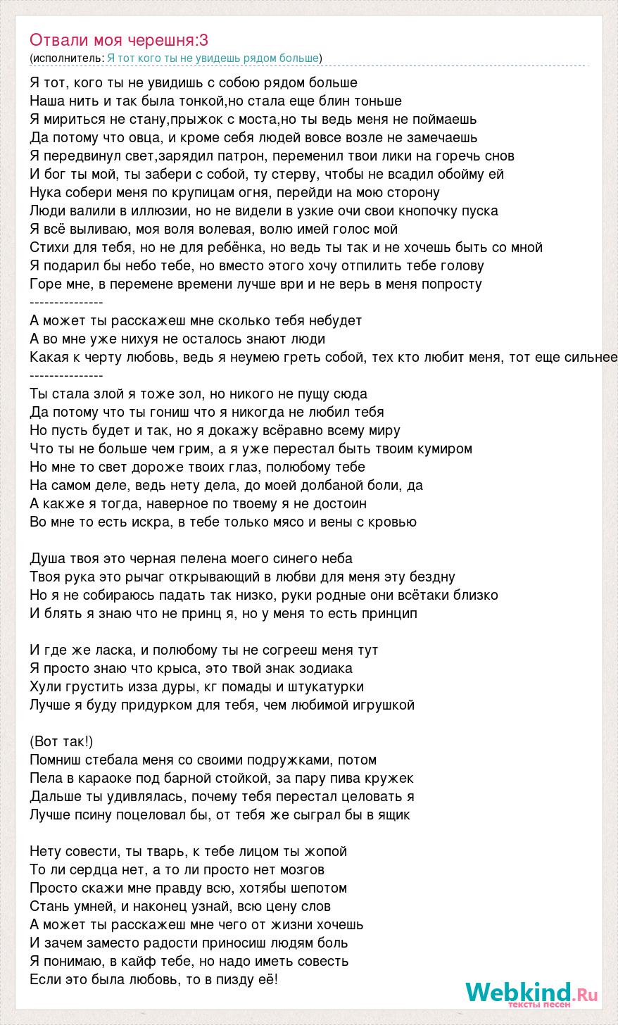 Я тот, кого ты не увидишь с собою рядом больше Наша нить и так была тонкой,но стала еще блин тоньше Я мириться не стану,прыжок с моста,но ты ведь меня не поймаешь Да потому что овца, и кроме себя людей вовсе возле не замечаешь Я передвинул свет,зарядил патрон, переменил твои лики на горечь снов И бог ты мой, ты забери с собой, ту стерву, чтобы не всадил обойму ей Нука собери меня по крупицам огня, перейди на мою сторону Люди валили в иллюзии, но не видели в узкие очи свои кнопочку пуска Я всё выливаю, моя воля волевая, волю имей голос мой Стихи для тебя, но не для ребёнка, но ведь ты так и не хочешь быть со мной Я подарил бы небо тебе, но вместо этого хочу отпилить тебе голову Горе мне, в перемене времени лучше ври и не верь в меня попросту --------------- А может ты расскажеш мне сколько тебя небудет А во мне уже нихуя не осталось знают люди Какая к черту любовь, ведь я неумею греть собой, тех кто любит меня, тот еще сильнее --------------- Ты стала злой я тоже зол, но никого не пущу сюда Да потому что ты гониш что я никогда не любил тебя Но пусть будет и так, но я докажу всёравно всему миру Что ты не больше чем грим, а я уже перестал быть твоим кумиром Но мне то свет дороже твоих глаз, полюбому тебе На самом деле, ведь нету дела, до моей долбаной боли, да А какже я тогда, наверное по твоему я не достоин Во мне то есть искра, в тебе только мясо и вены с кровью Душа твоя это черная пелена моего синего неба Твоя рука это рычаг открывающий в любви для меня эту бездну Но я не собираюсь падать так низко, руки родные они всётаки близко И блять я знаю что не принц я, но у меня то есть принцип И где же ласка, и полюбому ты не согрееш меня тут Я просто знаю что крыса, это твой знак зодиака Хули грустить изза дуры, кг помады и штукатурки Лучше я буду придурком для тебя, чем любимой игрушкой (Вот так!) Помниш стебала меня со своими подружками, потом Пела в караоке под барной стойкой, за пару пива кружек Дальше ты удивлялась, почему тебя перестал целовать я Лучше псину поцеловал бы, от тебя же сыграл бы в ящик Нету совести, ты тварь, к тебе лицом ты жопой То ли сердца нет, а то ли просто нет мозгов Просто скажи мне правду всю, хотябы шепотом Стань умней, и наконец узнай, всю цену слов А может ты расскажеш мне чего от жизни хочешь И зачем заместо радости приносиш людям боль Я понимаю, в кайф тебе, но надо иметь совесть Если это была любовь, то в пизду её!