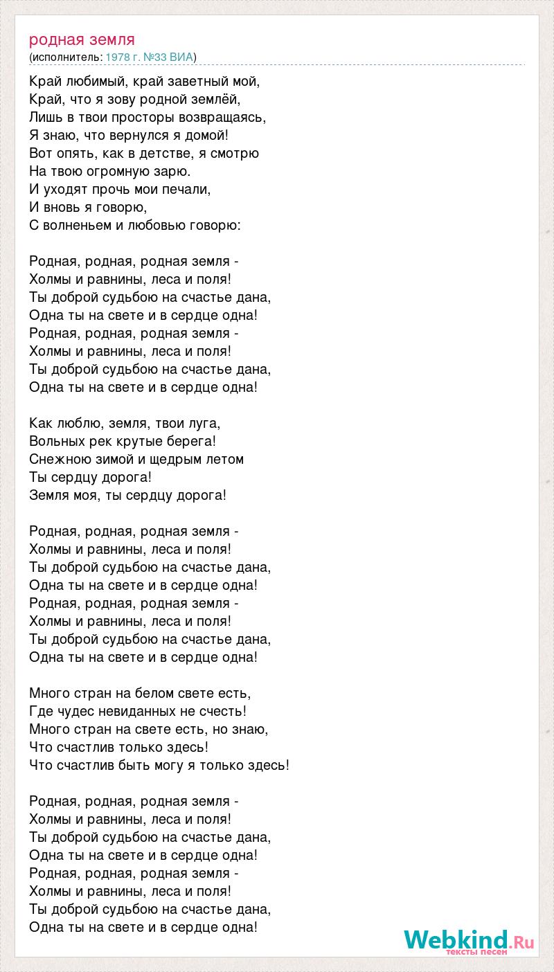 Край любимый, край заветный мой, Край, что я зову родной землёй, Лишь в твои просторы возвращаясь, Я знаю, что вернулся я домой! Вот опять, как в детстве, я смотрю На твою огромную зарю. И уходят прочь мои печали, И вновь я говорю, С волненьем и любовью говорю: Родная, родная, родная земля - Холмы и равнины, леса и поля! Ты доброй судьбою на счастье дана, Одна ты на свете и в сердце одна! Родная, родная, родная земля - Холмы и равнины, леса и поля! Ты доброй судьбою на счастье дана, Одна ты на свете и в сердце одна! Как люблю, земля, твои луга, Вольных рек крутые берега! Снежною зимой и щедрым летом Ты сердцу дорога! Земля моя, ты сердцу дорога! Родная, родная, родная земля - Холмы и равнины, леса и поля! Ты доброй судьбою на счастье дана, Одна ты на свете и в сердце одна! Родная, родная, родная земля - Холмы и равнины, леса и поля! Ты доброй судьбою на счастье дана, Одна ты на свете и в сердце одна! Много стран на белом свете есть, Где чудес невиданных не счесть! Много стран на свете есть, но знаю, Что счастлив только здесь! Что счастлив быть могу я только здесь! Родная, родная, родная земля - Холмы и равнины, леса и поля! Ты доброй судьбою на счастье дана, Одна ты на свете и в сердце одна! Родная, родная, родная земля - Холмы и равнины, леса и поля! Ты доброй судьбою на счастье дана, Одна ты на свете и в сердце одна!