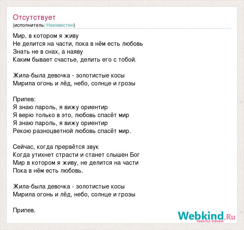 Мир, в котором я живу Не делится на части, пока в нём есть любовь Знать не в снах, а наяву Каким бывает счастье, делить его с тобой. Жила-была девочка - золотистые косы Мирила огонь и лёд, небо, солнце и грозы Припев: Я знаю пароль, я вижу ориентир Я верю только в это, любовь спасёт мир Я знаю пароль, я вижу ориентир Рекою разноцветной любовь спасёт мир. Сейчас, когда прервётся звук Когда утихнет страсти и станет слышен Бог Мир в котором я живу, не делится на части Пока в нём есть любовь. Жила-была девочка - золотистые косы Мирила огонь и лёд, небо, солнце и грозы Припев.