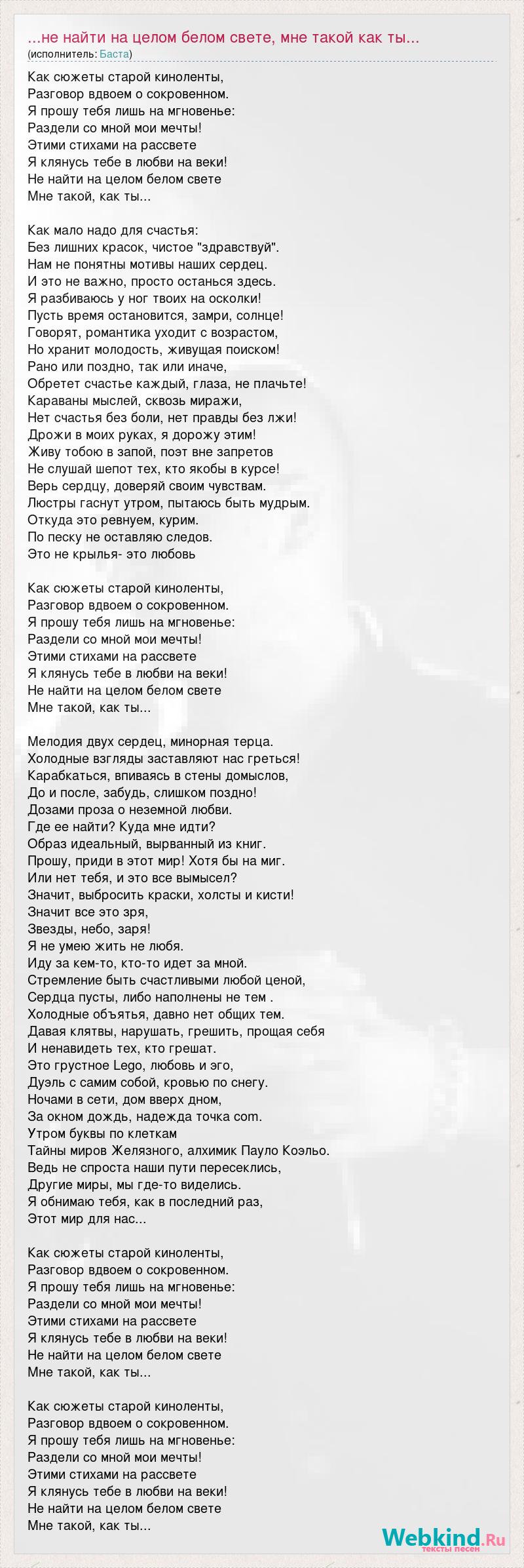 Как сюжеты старой киноленты, Разговор вдвоем о сокровенном. Я прошу тебя лишь на мгновенье: Раздели со мной мои мечты! Этими стихами на рассвете Я клянусь тебе в любви на веки! Не найти на целом белом свете Мне такой, как ты... Как мало надо для счастья: Без лишних красок, чистое "здравствуй". Нам не понятны мотивы наших сердец. И это не важно, просто останься здесь. Я разбиваюсь у ног твоих на осколки! Пусть время остановится, замри, солнце! Говорят, романтика уходит с возрастом, Но хранит молодость, живущая поиском! Рано или поздно, так или иначе, Обретет счастье каждый, глаза, не плачьте! Караваны мыслей, сквозь миражи, Нет счастья без боли, нет правды без лжи! Дрожи в моих руках, я дорожу этим! Живу тобою в запой, поэт вне запретов Не слушай шепот тех, кто якобы в курсе! Верь сердцу, доверяй своим чувствам. Люстры гаснут утром, пытаюсь быть мудрым. Откуда это ревнуем, курим. По песку не оставляю следов. Это не крылья- это любовь Как сюжеты старой киноленты, Разговор вдвоем о сокровенном. Я прошу тебя лишь на мгновенье: Раздели со мной мои мечты! Этими стихами на рассвете Я клянусь тебе в любви на веки! Не найти на целом белом свете Мне такой, как ты... Мелодия двух сердец, минорная терца. Холодные взгляды заставляют нас греться! Карабкаться, впиваясь в стены домыслов, До и после, забудь, слишком поздно! Дозами проза о неземной любви. Где ее найти? Куда мне идти? Образ идеальный, вырванный из книг. Прошу, приди в этот мир! Хотя бы на миг. Или нет тебя, и это все вымысел? Значит, выбросить краски, холсты и кисти! Значит все это зря, Звезды, небо, заря! Я не умею жить не любя. Иду за кем-то, кто-то идет за мной. Стремление быть счастливыми любой ценой, Сердца пусты, либо наполнены не тем . Холодные объятья, давно нет общих тем. Давая клятвы, нарушать, грешить, прощая себя И ненавидеть тех, кто грешат. Это грустное Lego, любовь и эго, Дуэль с самим собой, кровью по снегу. Ночами в сети, дом вверх дном, За окном дождь, надежда точка com. Утром буквы по клеткам Тайны миров Желязного, алхимик Пауло Коэльо. Ведь не спроста наши пути пересеклись, Другие миры, мы где-то виделись. Я обнимаю тебя, как в последний раз, Этот мир для нас... Как сюжеты старой киноленты, Разговор вдвоем о сокровенном. Я прошу тебя лишь на мгновенье: Раздели со мной мои мечты! Этими стихами на рассвете Я клянусь тебе в любви на веки! Не найти на целом белом свете Мне такой, как ты... Как сюжеты старой киноленты, Разговор вдвоем о сокровенном. Я прошу тебя лишь на мгновенье: Раздели со мной мои мечты! Этими стихами на рассвете Я клянусь тебе в любви на веки! Не найти на целом белом свете Мне такой, как ты...