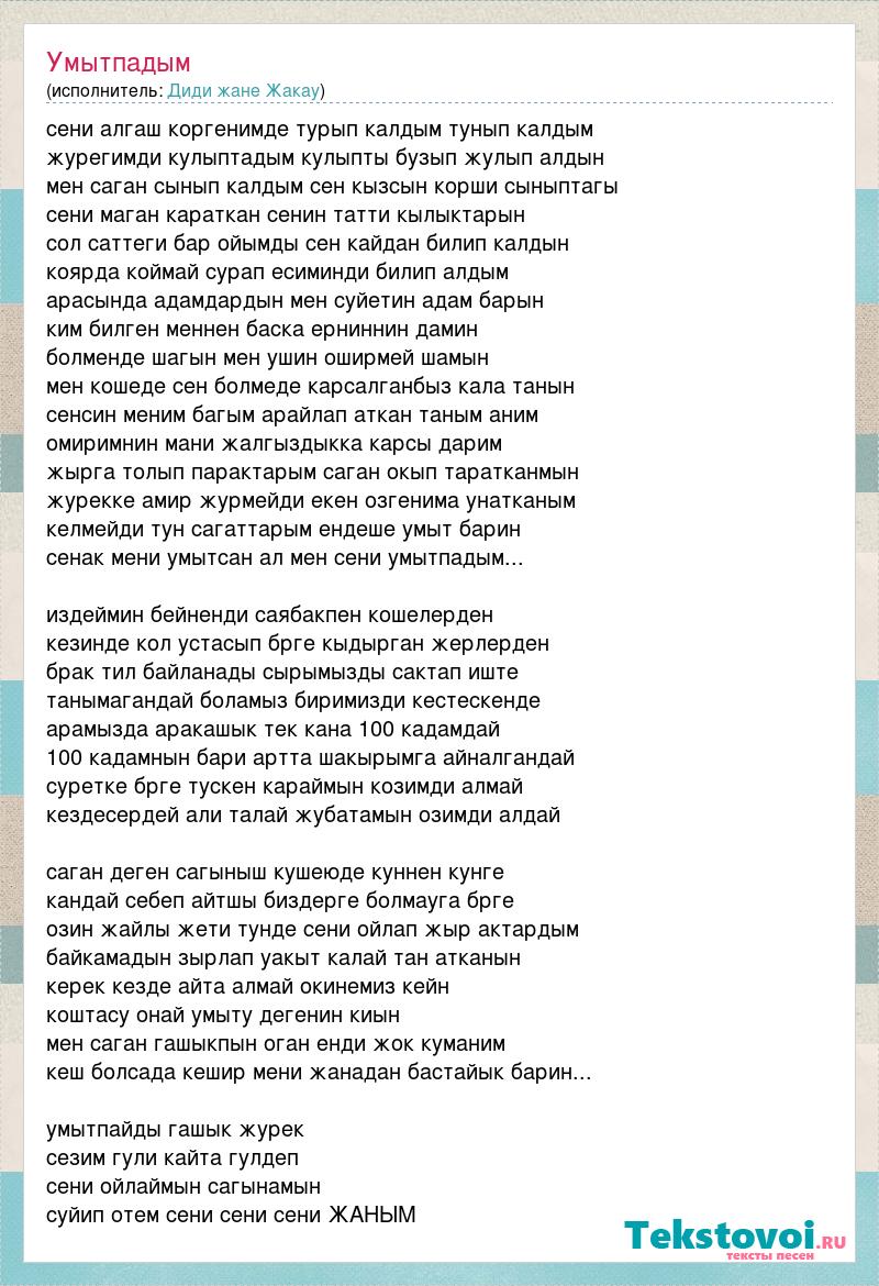 сени алгаш коргенимде турып калдым тунып калдым журегимди кулыптадым кулыпты бузып жулып алдын мен саган сынып калдым сен кызсын корши сыныптагы сени маган караткан сенин татти кылыктарын сол саттеги бар ойымды сен кайдан билип калдын коярда коймай сурап есиминди билип алдым арасында адамдардын мен суйетин адам барын ким билген меннен баска ерниннин дамин болменде шагын мен ушин оширмей шамын мен кошеде сен болмеде карсалганбыз кала танын сенсин меним багым арайлап аткан таным аним омиримнин мани жалгыздыкка карсы дарим жырга толып парактарым саган окып таратканмын журекке амир журмейди екен озгенима унатканым келмейди тун сагаттарым ендеше умыт барин сенак мени умытсан ал мен сени умытпадым... издеймин бейненди саябакпен кошелерден кезинде кол устасып брге кыдырган жерлерден брак тил байланады сырымызды сактап иште танымагандай боламыз биримизди кестескенде арамызда аракашык тек кана 100 кадамдай 100 кадамнын бари артта шакырымга айналгандай суретке брге тускен караймын козимди алмай кездесердей али талай жубатамын озимди алдай саган деген сагыныш кушеюде куннен кунге кандай себеп айтшы биздерге болмауга брге озин жайлы жети тунде сени ойлап жыр актардым байкамадын зырлап уакыт калай тан атканын керек кезде айта алмай окинемиз кейн коштасу онай умыту дегенин киын мен саган гашыкпын оган енди жок куманим кеш болсада кешир мени жанадан бастайык барин... умытпайды гашык журек сезим гули кайта гулдеп сени ойлаймын сагынамын суйип отем сени сени сени ЖАНЫМ