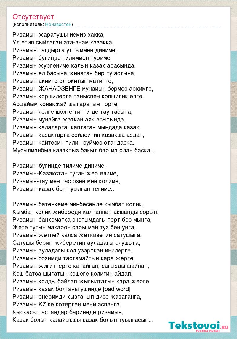 Ризамын жаратушы иемиз хакка, Ул етип сыйлаган ата-анам казакка, Ризамын тагдырга ултыммен диниме, Ризамын бугинде тилиммен туриме, Ризамын жургениме калын казак арасында, Ризамын ел басына жинаган бир ту астына, Ризамын акимге ол окитын матинге, Ризамын ЖАНАОЗЕНГЕ мунайын бермес аркимге, Ризамын коршилерге таныспен копшилик елге, Ардайым конакжай шыгаратын торге, Ризамын колге шолге типти де тау тасына, Ризамын мунайга жаткан аяк асытында, Ризамын калаларга каптаган мындада казак, Ризамын казактарга сойлейтин казакша аздап, Ризамын кайтесин тилин суймес отандаска, Мусылманбыз казакпыз бакыт бар ма одан баска... Ризамын-бугинде тилиме диниме, Ризамын-Казакстан туган жер елиме, Ризамын-тау мен тас озен мен колиме, Ризамын-казак боп туылган тегиме.. Ризамын батенкеме минбесемде кымбат колик, Кымбат колик жибереди калтаннан акшанды сорып, Ризамын банкоматка счетымдагы торт бес мынга, Жете тугын макарон сары май туз бен унга, Ризамын жетпей калса жеткизетин сатушыга, Сатушы берип жиберетин ауладагы окушыга, Ризамын ауладагы кол узарткан инилерге, Ризамын созимди тастамайтын кара жерге, Ризамын жигиттерге катайган, сагызды шайнап, Кеш батса шыгатын кошеге колигин айдап, Ризамын колды байлап жыгылтатын кара жерге, Ризамын казак болганы ушинде [bad word] Ризамын онеримди кызганып дисс жазаганга, Ризамын KZ ке котерген мени аспанга, Кыскасы тастандар баринеде ризамын, Казак болып калайыкшы казак болып туылгасын...