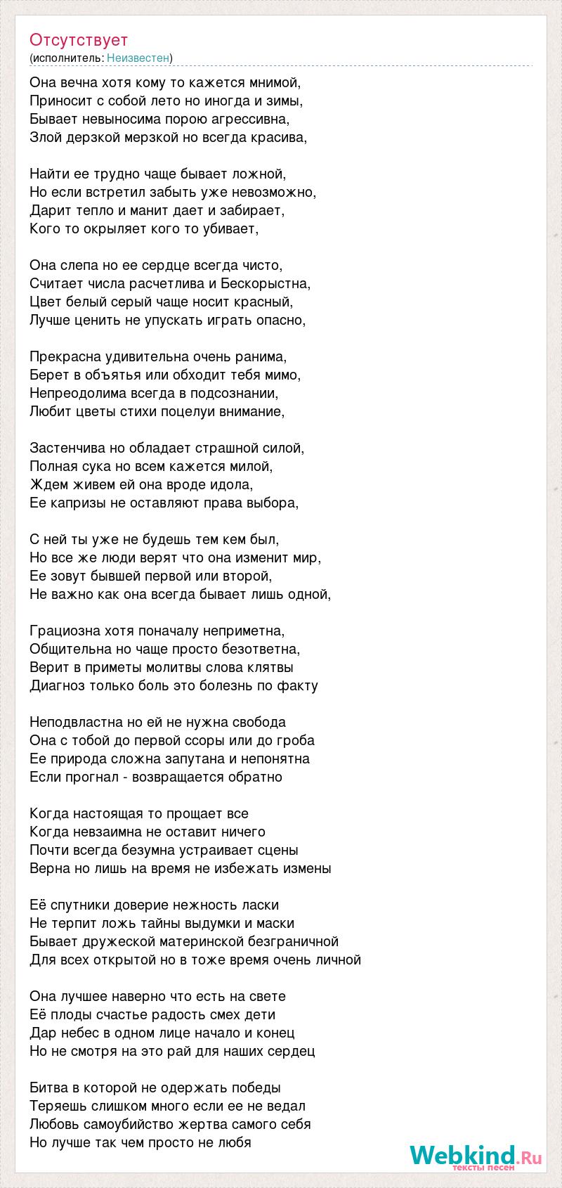 Она вечна хотя кому то кажется мнимой, Приносит с собой лето но иногда и зимы, Бывает невыносима порою агрессивна, Злой дерзкой мерзкой но всегда красива, Найти ее трудно чаще бывает ложной, Но если встретил забыть уже невозможно, Дарит тепло и манит дает и забирает, Кого то окрыляет кого то убивает, Она слепа но ее сердце всегда чисто, Считает числа расчетлива и Бескорыстна, Цвет белый серый чаще носит красный, Лучше ценить не упускать играть опасно, Прекрасна удивительна очень ранима, Берет в объятья или обходит тебя мимо, Непреодолима всегда в подсознании, Любит цветы стихи поцелуи внимание, Застенчива но обладает страшной силой, Полная сука но всем кажется милой, Ждем живем ей она вроде идола, Ее капризы не оставляют права выбора, С ней ты уже не будешь тем кем был, Но все же люди верят что она изменит мир, Ее зовут бывшей первой или второй, Не важно как она всегда бывает лишь одной, Грациозна хотя поначалу неприметна, Общительна но чаще просто безответна, Верит в приметы молитвы слова клятвы Диагноз только боль это болезнь по факту Неподвластна но ей не нужна свобода Она с тобой до первой ссоры или до гроба Ее природа сложна запутана и непонятна Если прогнал - возвращается обратно Когда настоящая то прощает все Когда невзаимна не оставит ничего Почти всегда безумна устраивает сцены Верна но лишь на время не избежать измены Её спутники доверие нежность ласки Не терпит ложь тайны выдумки и маски Бывает дружеской материнской безграничной Для всех открытой но в тоже время очень личной Она лучшее наверно что есть на свете Её плоды счастье радость смех дети Дар небес в одном лице начало и конец Но не смотря на это рай для наших сердец Битва в которой не одержать победы Теряешь слишком много если ее не ведал Любовь самоубийство жертва самого себя Но лучше так чем просто не любя