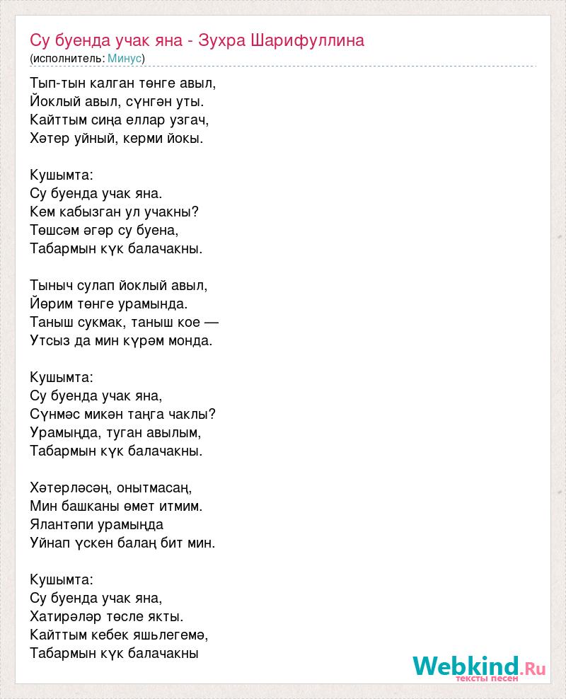 Тып-тын калган төнге авыл, Йоклый авыл, сүнгән уты. Кайттым сиңа еллар узгач, Хәтер уйный, керми йокы. Кушымта: Су буенда учак яна. Кем кабызган ул учакны? Төшсәм әгәр су буена, Табармын күк балачакны. Тыныч сулап йоклый авыл, Йөрим төнге урамында. Таныш сукмак, таныш кое — Утсыз да мин күрәм монда. Кушымта: Су буенда учак яна, Сүнмәс микән таңга чаклы? Урамыңда, туган авылым, Табармын күк балачакны. Хәтерләсәң, онытмасаң, Мин башканы өмет итмим. Ялантәпи урамыңда Уйнап үскен балаң бит мин. Кушымта: Су буенда учак яна, Хатирәләр төсле якты. Кайттым кебек яшьлегемә, Табармын күк балачакны