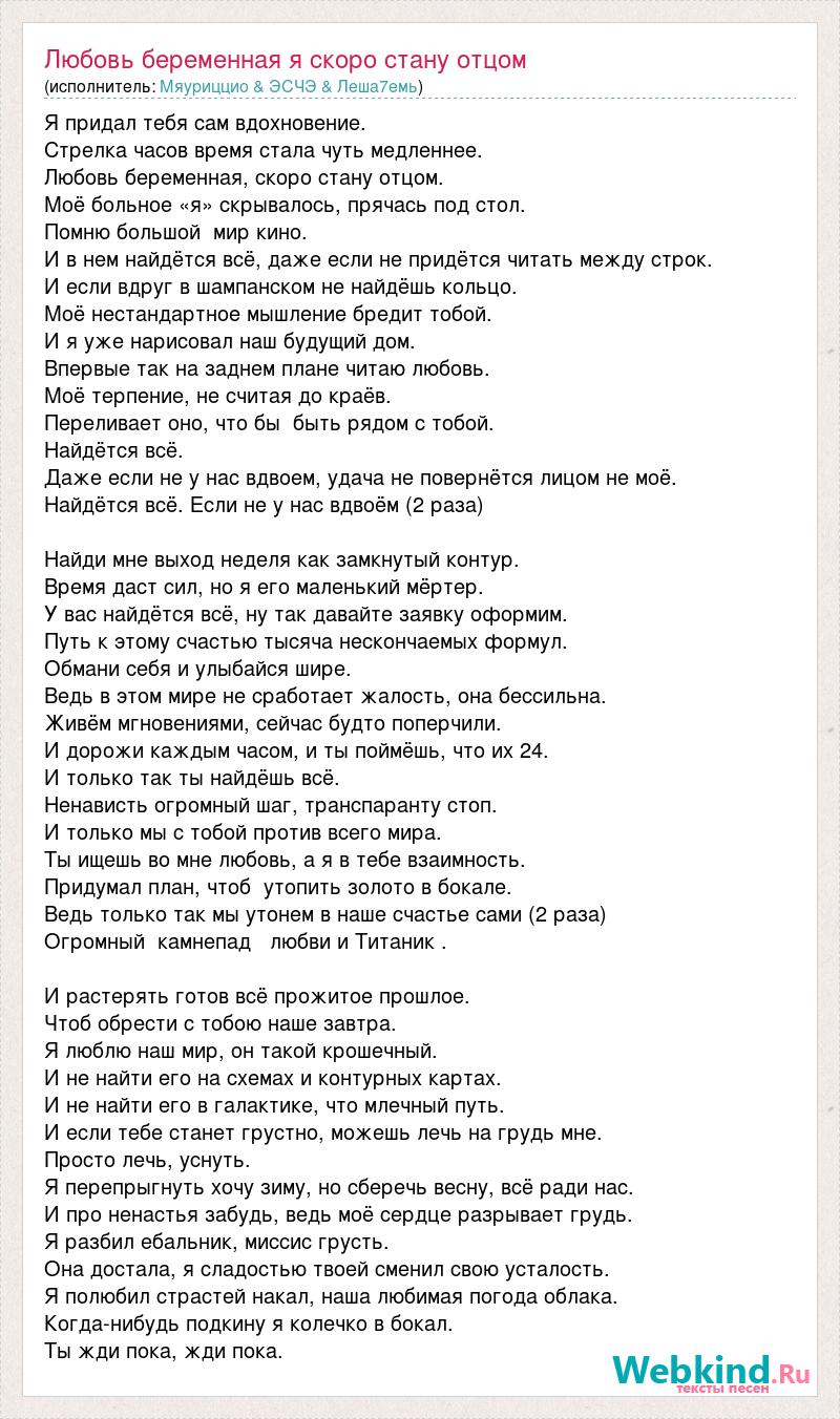 Я придал тебя сам вдохновение. Стрелка часов время стала чуть медленнее. Любовь беременная, скоро стану отцом. Моё больное «я» скрывалось, прячась под стол. Помню большой мир кино. И в нем найдётся всё, даже если не придётся читать между строк. И если вдруг в шампанском не найдёшь кольцо. Моё нестандартное мышление бредит тобой. И я уже нарисовал наш будущий дом. Впервые так на заднем плане читаю любовь. Моё терпение, не считая до краёв. Переливает оно, что бы быть рядом с тобой. Найдётся всё. Даже если не у нас вдвоем, удача не повернётся лицом не моё. Найдётся всё. Если не у нас вдвоём (2 раза) Найди мне выход неделя как замкнутый контур. Время даст сил, но я его маленький мёртер. У вас найдётся всё, ну так давайте заявку оформим. Путь к этому счастью тысяча нескончаемых формул. Обмани себя и улыбайся шире. Ведь в этом мире не сработает жалость, она бессильна. Живём мгновениями, сейчас будто поперчили. И дорожи каждым часом, и ты поймёшь, что их 24. И только так ты найдёшь всё. Ненависть огромный шаг, транспаранту стоп. И только мы с тобой против всего мира. Ты ищешь во мне любовь, а я в тебе взаимность. Придумал план, чтоб утопить золото в бокале. Ведь только так мы утонем в наше счастье сами (2 раза) Огромный камнепад любви и Титаник . И растерять готов всё прожитое прошлое. Чтоб обрести с тобою наше завтра. Я люблю наш мир, он такой крошечный. И не найти его на схемах и контурных картах. И не найти его в галактике, что млечный путь. И если тебе станет грустно, можешь лечь на грудь мне. Просто лечь, уснуть. Я перепрыгнуть хочу зиму, но сберечь весну, всё ради нас. И про ненастья забудь, ведь моё сердце разрывает грудь. Я разбил ебальник, миссис грусть. Она достала, я сладостью твоей сменил свою усталость. Я полюбил страстей накал, наша любимая погода облака. Когда-нибудь подкину я колечко в бокал. Ты жди пока, жди пока.