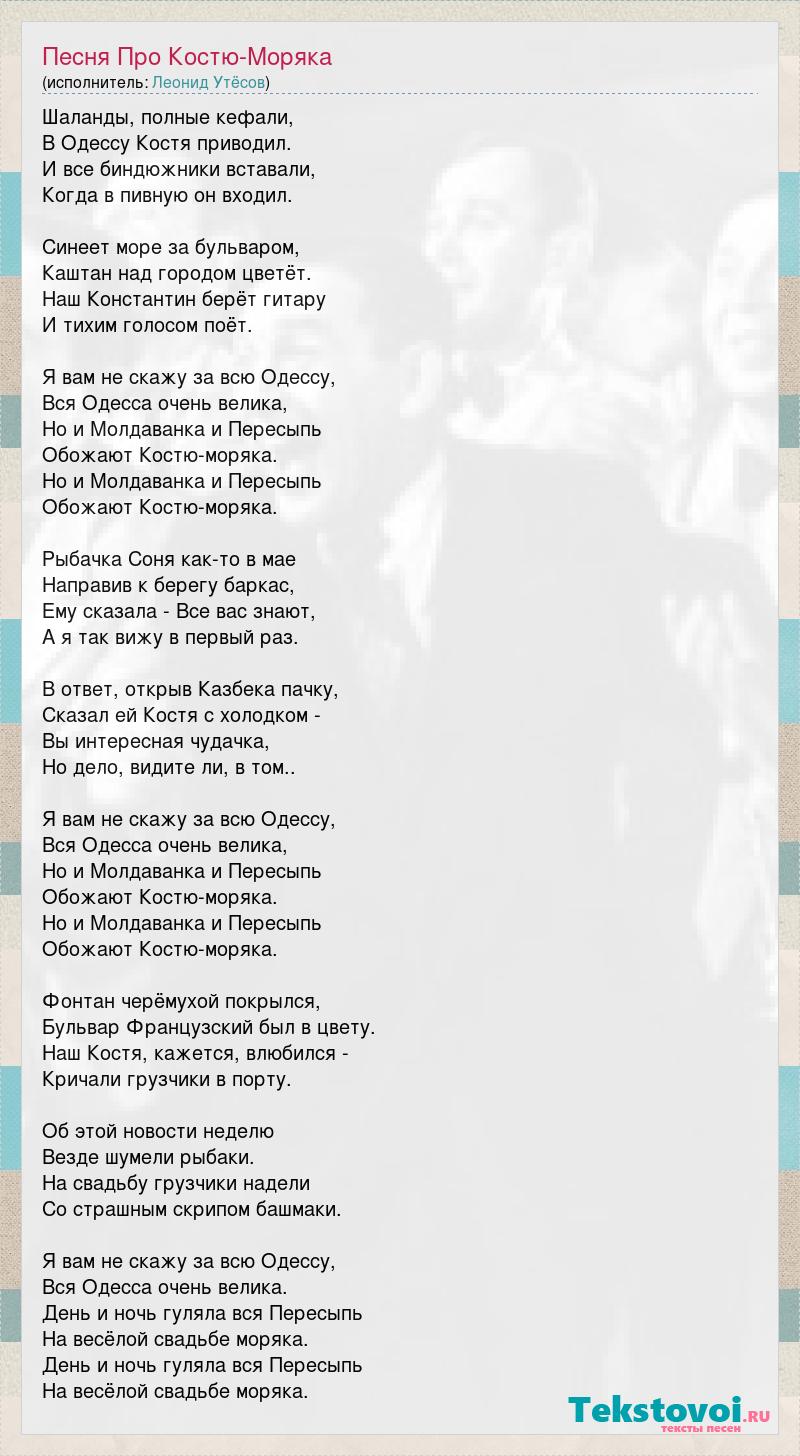 Шаланды, полные кефали, В Одессу Костя приводил. И все биндюжники вставали, Когда в пивную он входил. Синеет море за бульваром, Каштан над городом цветёт. Наш Константин берёт гитару И тихим голосом поёт. Я вам не скажу за всю Одессу, Вся Одесса очень велика, Но и Молдаванка и Пересыпь Обожают Костю-моряка. Но и Молдаванка и Пересыпь Обожают Костю-моряка. Рыбачка Соня как-то в мае Направив к берегу баркас, Ему сказала - Все вас знают, А я так вижу в первый раз. В ответ, открыв Казбека пачку, Сказал ей Костя с холодком - Вы интересная чудачка, Но дело, видите ли, в том.. Я вам не скажу за всю Одессу, Вся Одесса очень велика, Но и Молдаванка и Пересыпь Обожают Костю-моряка. Но и Молдаванка и Пересыпь Обожают Костю-моряка. Фонтан черёмухой покрылся, Бульвар Французский был в цвету. Наш Костя, кажется, влюбился - Кричали грузчики в порту. Об этой новости неделю Везде шумели рыбаки. На свадьбу грузчики надели Со страшным скрипом башмаки. Я вам не скажу за всю Одессу, Вся Одесса очень велика. День и ночь гуляла вся Пересыпь На весёлой свадьбе моряка. День и ночь гуляла вся Пересыпь На весёлой свадьбе моряка.