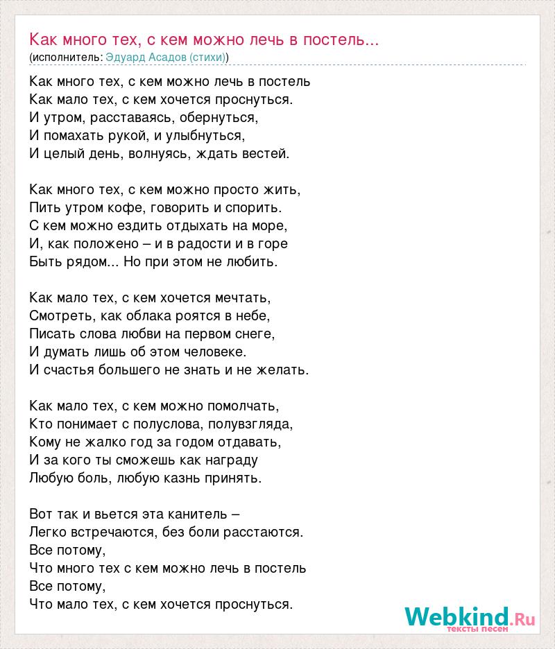 Как много тех, с кем можно лечь в постель Как мало тех, с кем хочется проснуться. И утром, расставаясь, обернуться, И помахать рукой, и улыбнуться, И целый день, волнуясь, ждать вестей. Как много тех, с кем можно просто жить, Пить утром кофе, говорить и спорить. С кем можно ездить отдыхать на море, И, как положено – и в радости и в горе Быть рядом... Но при этом не любить. Как мало тех, с кем хочется мечтать, Смотреть, как облака роятся в небе, Писать слова любви на первом снеге, И думать лишь об этом человеке. И счастья большего не знать и не желать. Как мало тех, с кем можно помолчать, Кто понимает с полуслова, полувзгляда, Кому не жалко год за годом отдавать, И за кого ты сможешь как награду Любую боль, любую казнь принять. Вот так и вьется эта канитель – Легко встречаются, без боли расстаются. Все потому, Что много тех с кем можно лечь в постель Все потому, Что мало тех, с кем хочется проснуться.