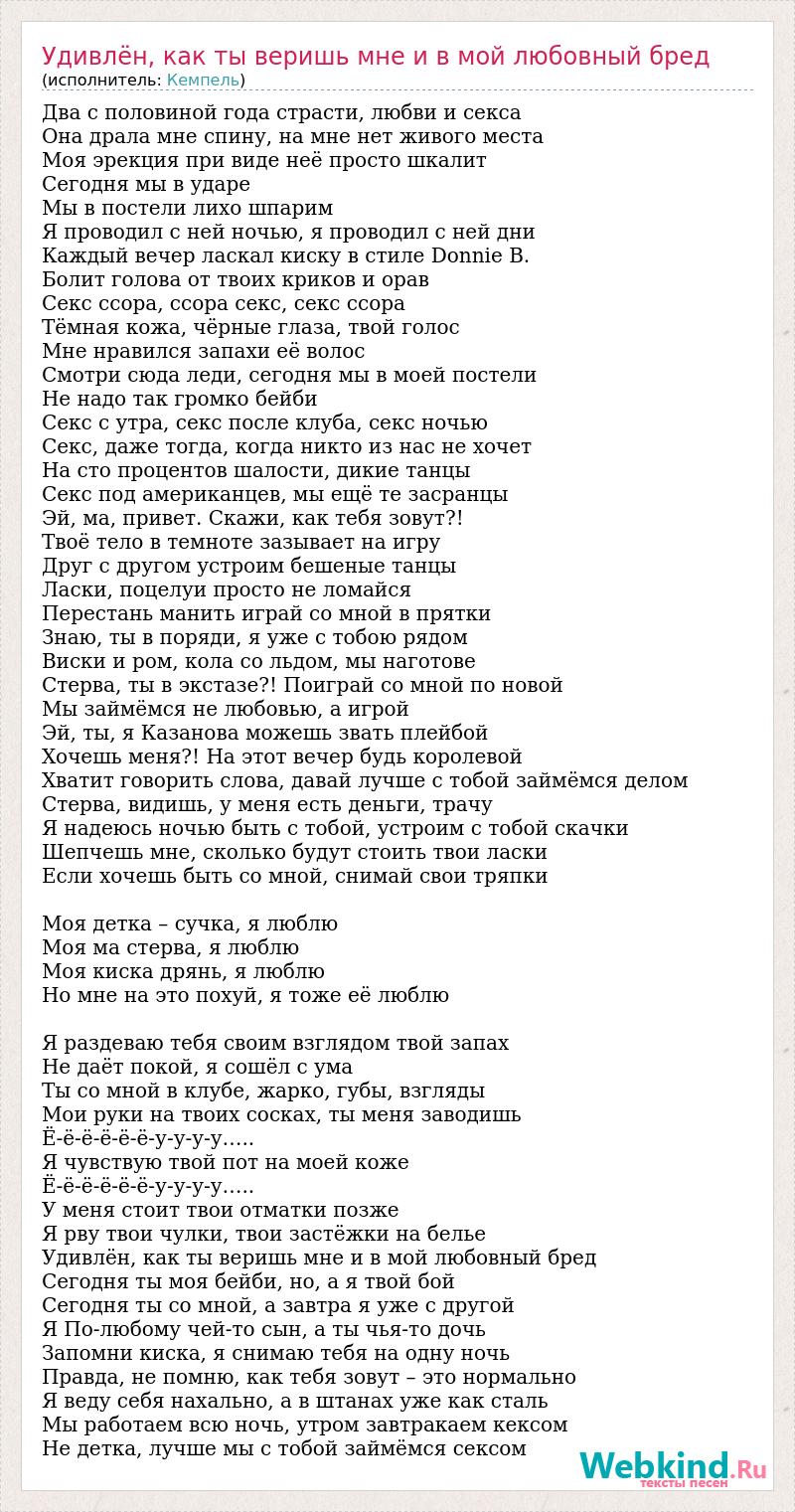 Два с половиной года страсти, любви и секса Она драла мне спину, на мне нет живого места Моя эрекция при виде неё просто шкалит Сегодня мы в ударе Мы в постели лихо шпарим Я проводил с ней ночью, я проводил с ней дни Каждый вечер ласкал киску в стиле Donnie B. Болит голова от твоих криков и орав Секс ссора, ссора секс, секс ссора Тёмная кожа, чёрные глаза, твой голос Мне нравился запахи её волос Смотри сюда леди, сегодня мы в моей постели Не надо так громко бейби Секс с утра, секс после клуба, секс ночью Секс, даже тогда, когда никто из нас не хочет На сто процентов шалости, дикие танцы Секс под американцев, мы ещё те засранцы Эй, ма, привет. Скажи, как тебя зовут?! Твоё тело в темноте зазывает на игру Друг с другом устроим бешеные танцы Ласки, поцелуи просто не ломайся Перестань манить играй со мной в прятки Знаю, ты в поряди, я уже с тобою рядом Виски и ром, кола со льдом, мы наготове Стерва, ты в экстазе?! Поиграй со мной по новой Мы займёмся не любовью, а игрой Эй, ты, я Казанова можешь звать плейбой Хочешь меня?! На этот вечер будь королевой Хватит говорить слова, давай лучше с тобой займёмся делом Стерва, видишь, у меня есть деньги, трачу Я надеюсь ночью быть с тобой, устроим с тобой скачки Шепчешь мне, сколько будут стоить твои ласки Если хочешь быть со мной, снимай свои тряпки Моя детка – сучка, я люблю Моя ма стерва, я люблю Моя киска дрянь, я люблю Но мне на это похуй, я тоже её люблю Я раздеваю тебя своим взглядом твой запах Не даёт покой, я сошёл с ума Ты со мной в клубе, жарко, губы, взгляды Мои руки на твоих сосках, ты меня заводишь Ё-ё-ё-ё-ё-ё-у-у-у-у….. Я чувствую твой пот на моей коже Ё-ё-ё-ё-ё-ё-у-у-у-у….. У меня стоит твои отматки позже Я рву твои чулки, твои застёжки на белье Удивлён, как ты веришь мне и в мой любовный бред Сегодня ты моя бейби, но, а я твой бой Сегодня ты со мной, а завтра я уже с другой Я По-любому чей-то сын, а ты чья-то дочь Запомни киска, я снимаю тебя на одну ночь Правда, не помню, как тебя зовут – это нормально Я веду себя нахально, а в штанах уже как сталь Мы работаем всю ночь, утром завтракаем кексом Не детка, лучше мы с тобой займёмся сексом
