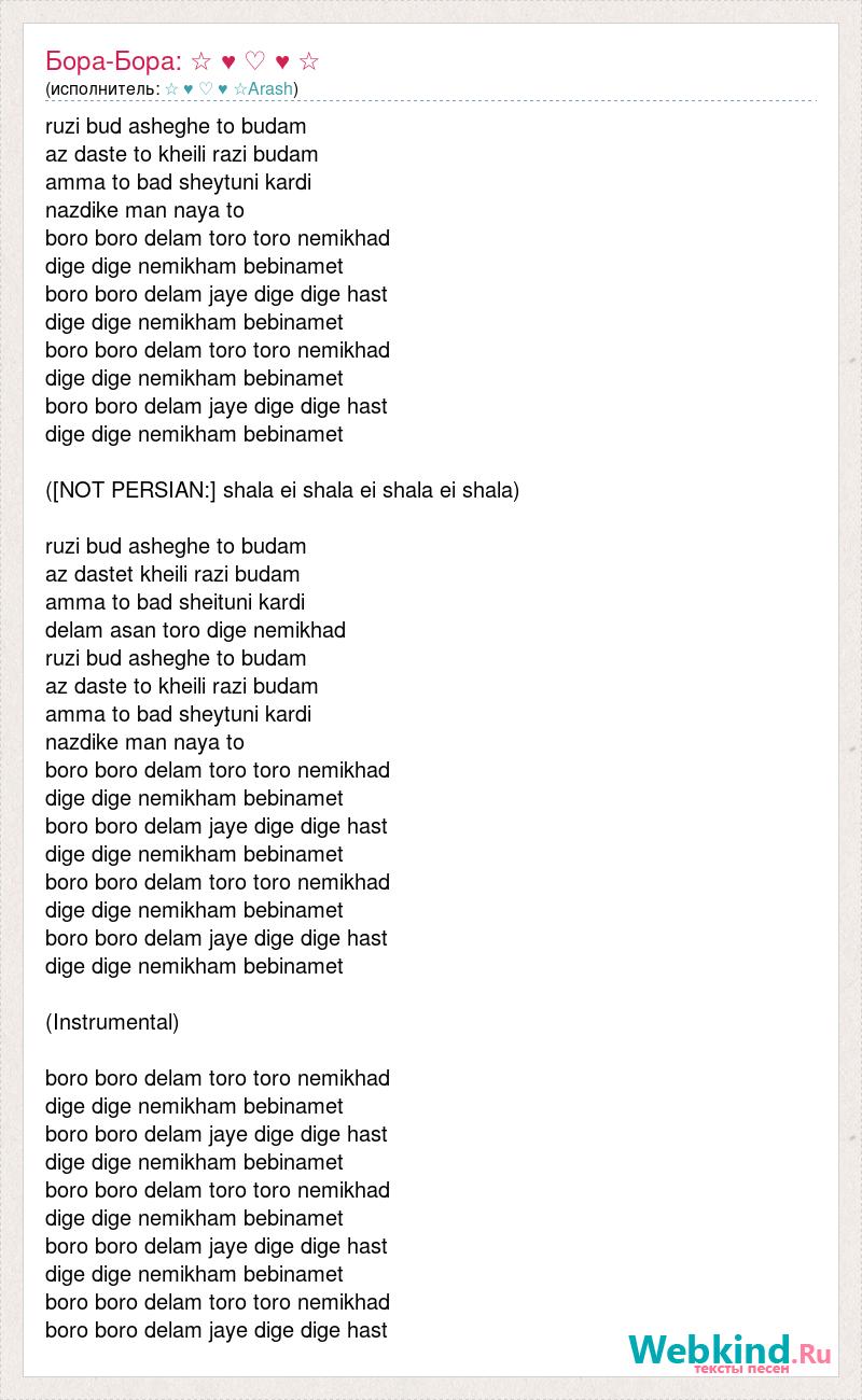 ruzi bud asheghe to budam az daste to kheili razi budam amma to bad sheytuni kardi nazdike man naya to boro boro delam toro toro nemikhad dige dige nemikham bebinamet boro boro delam jaye dige dige hast dige dige nemikham bebinamet boro boro delam toro toro nemikhad dige dige nemikham bebinamet boro boro delam jaye dige dige hast dige dige nemikham bebinamet ([NOT PERSIAN:] shala ei shala ei shala ei shala) ruzi bud asheghe to budam az dastet kheili razi budam amma to bad sheituni kardi delam asan toro dige nemikhad ruzi bud asheghe to budam az daste to kheili razi budam amma to bad sheytuni kardi nazdike man naya to boro boro delam toro toro nemikhad dige dige nemikham bebinamet boro boro delam jaye dige dige hast dige dige nemikham bebinamet boro boro delam toro toro nemikhad dige dige nemikham bebinamet boro boro delam jaye dige dige hast dige dige nemikham bebinamet (Instrumental) boro boro delam toro toro nemikhad dige dige nemikham bebinamet boro boro delam jaye dige dige hast dige dige nemikham bebinamet boro boro delam toro toro nemikhad dige dige nemikham bebinamet boro boro delam jaye dige dige hast dige dige nemikham bebinamet boro boro delam toro toro nemikhad boro boro delam jaye dige dige hast